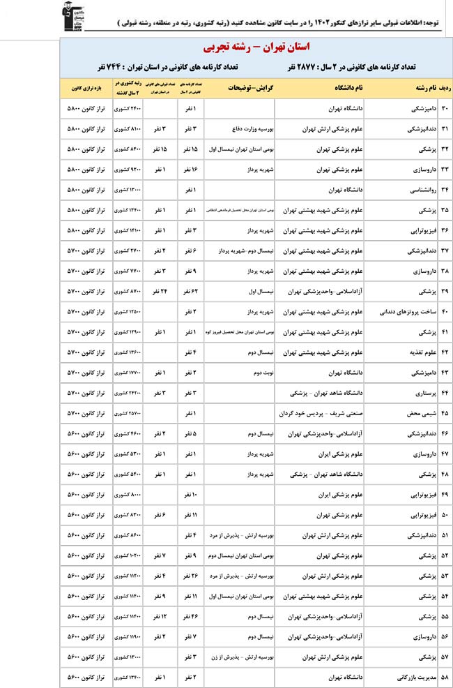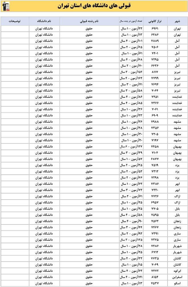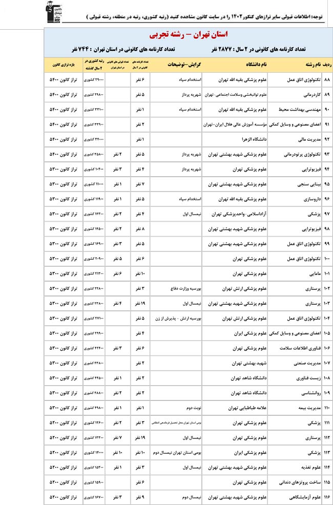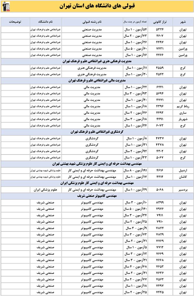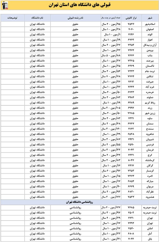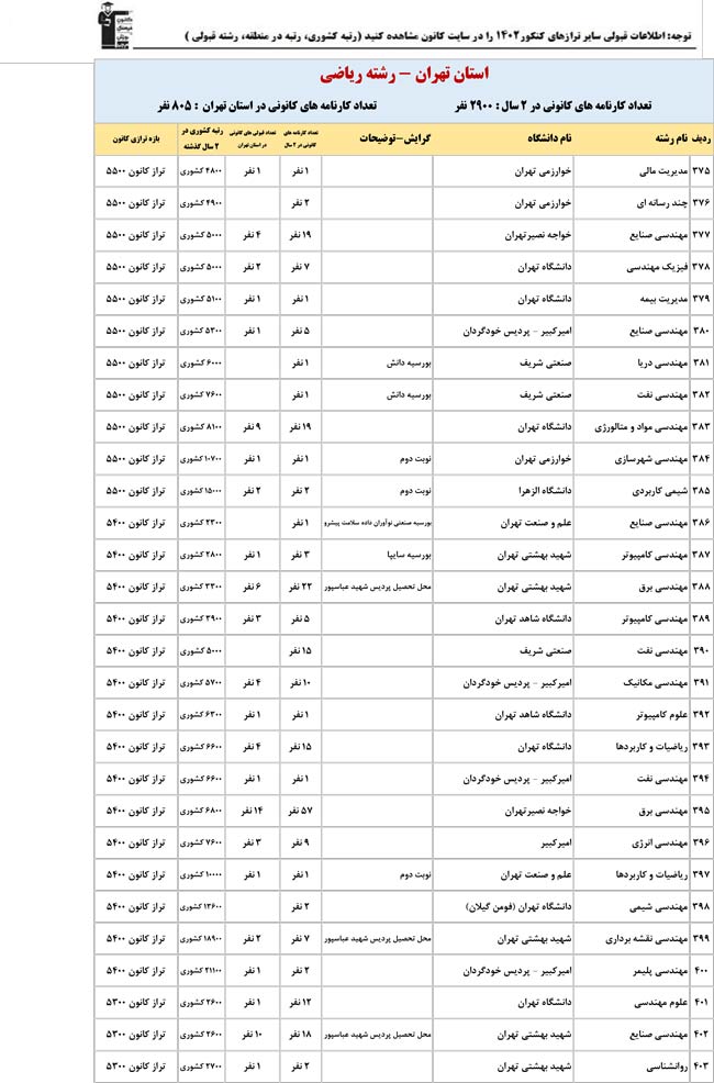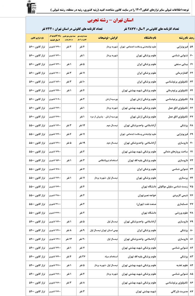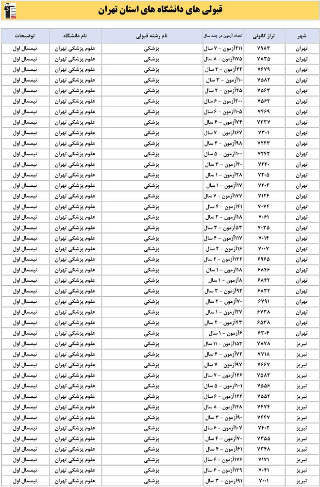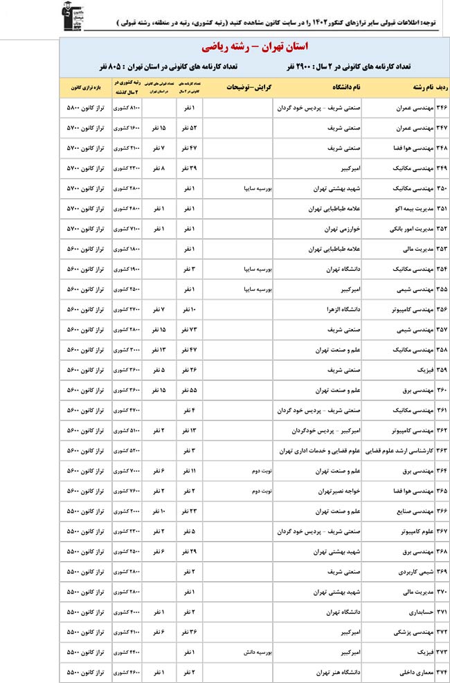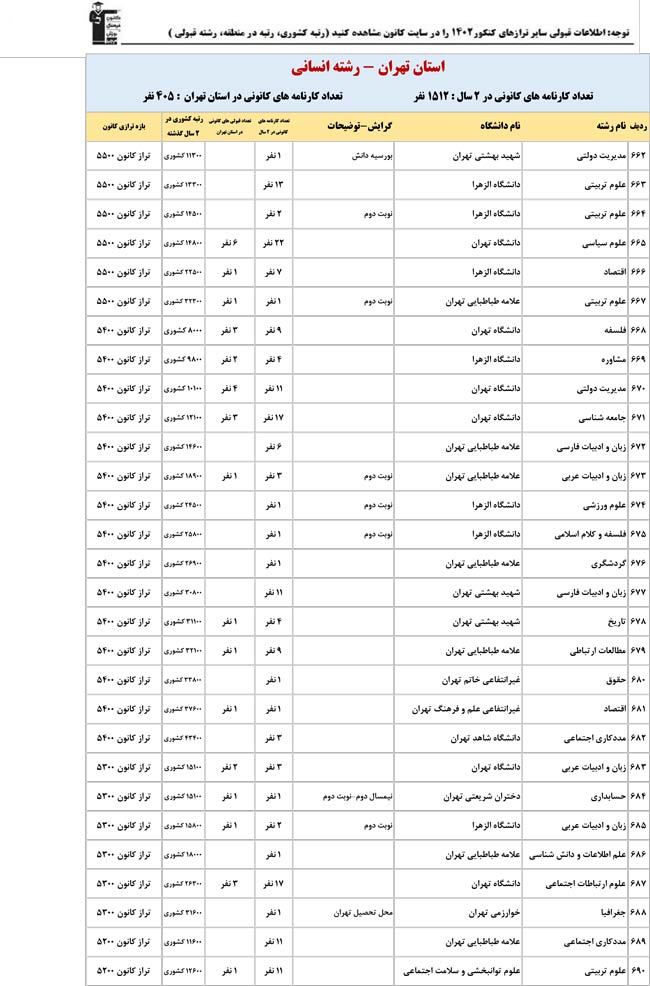 این آمار و اطلاعات مربوط به رشته های دانشگاه های استان تهران و دانش آموزان دو سال قبل کانون(کنکور1401 و 1402) می باشد .شما می توانید نمره ی تراز خود را پیدا کنید و متوجه شوید ، آن ها که پارسال ترازشان مثل شما بوده چه رشته هایی قبول شدند.