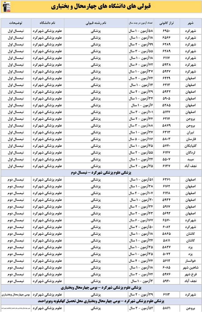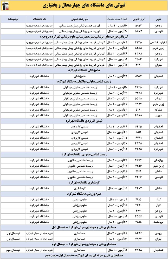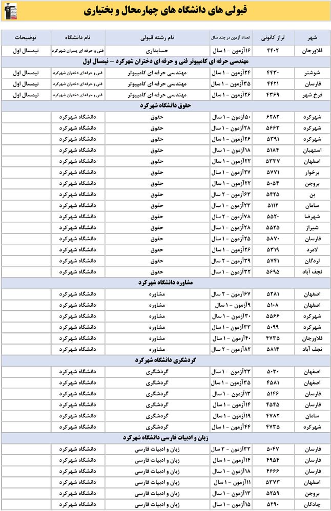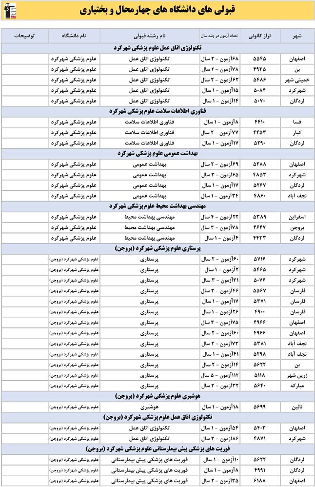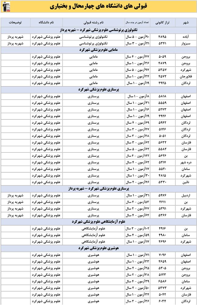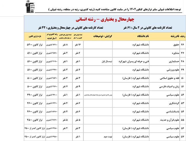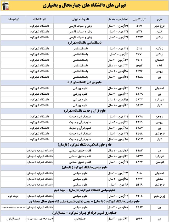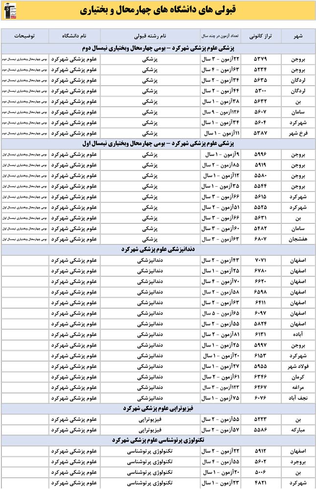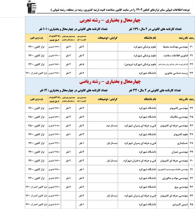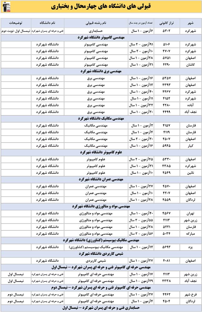 این آمار و اطلاعات مربوط به رشته های دانشگاه های استان چهارمحال و بختیاری و دانش آموزان دو سال قبل کانون(کنکور1401 و 1402) می باشد .شما می توانید نمره ی تراز خود را پیدا کنید و متوجه شوید ، آن ها که پارسال ترازشان مثل شما بوده چه رشته هایی قبول شدند.