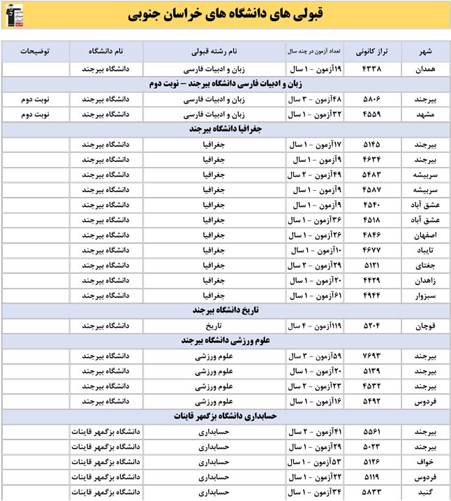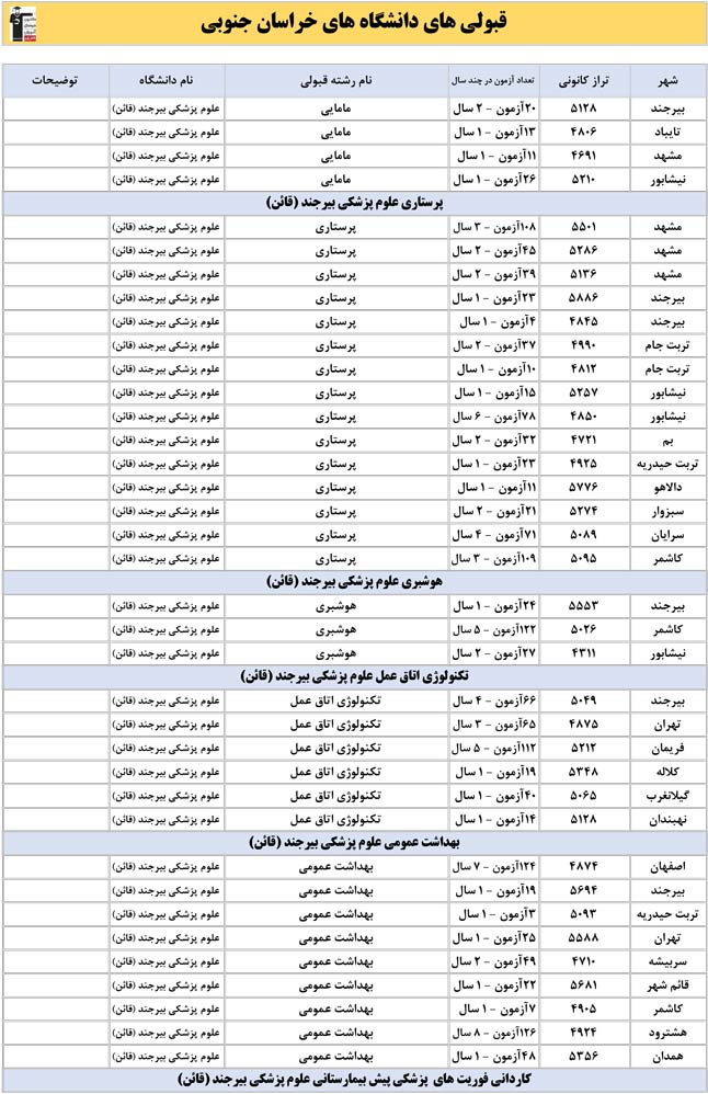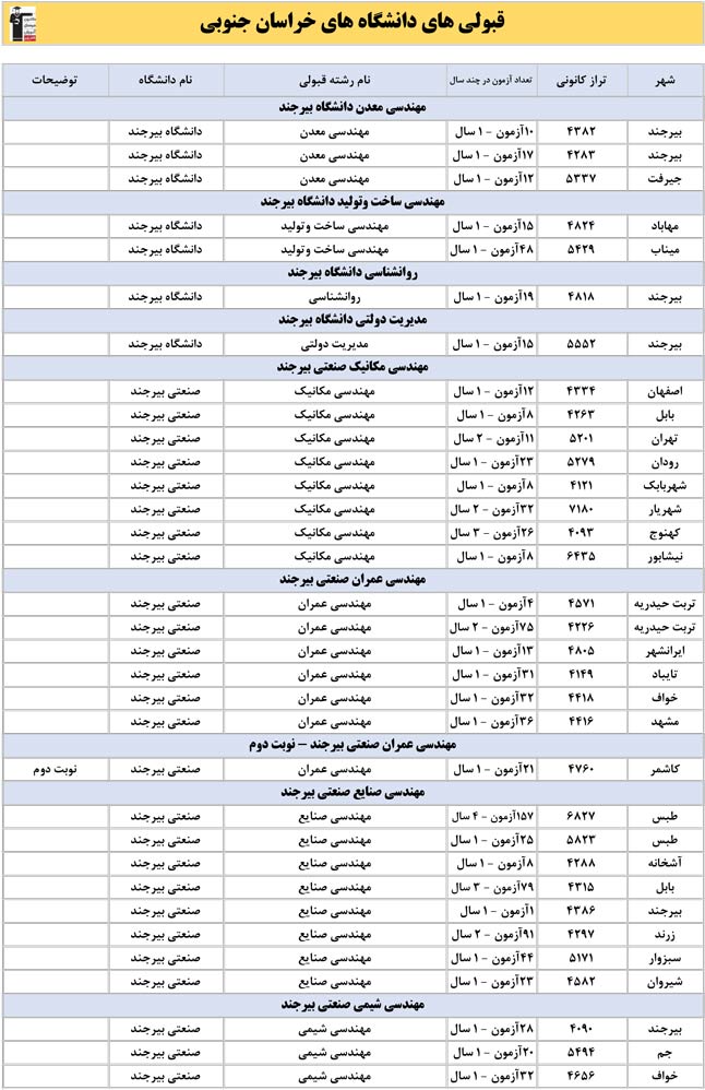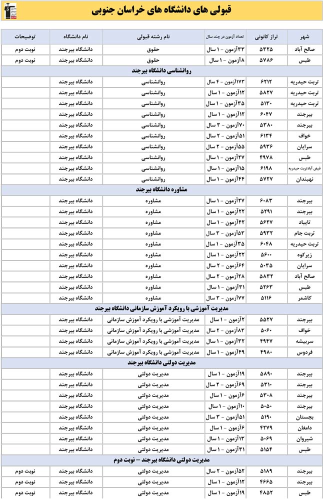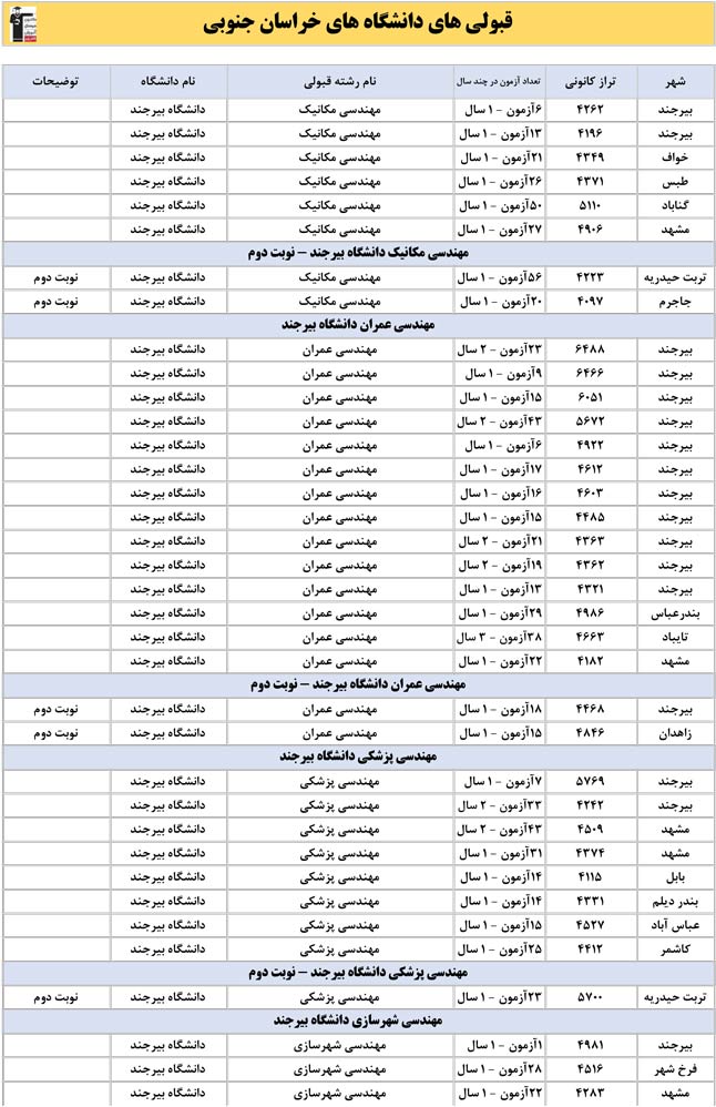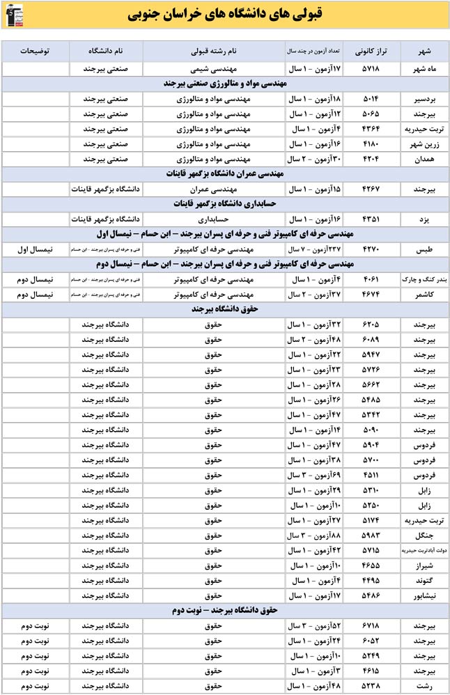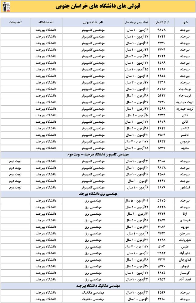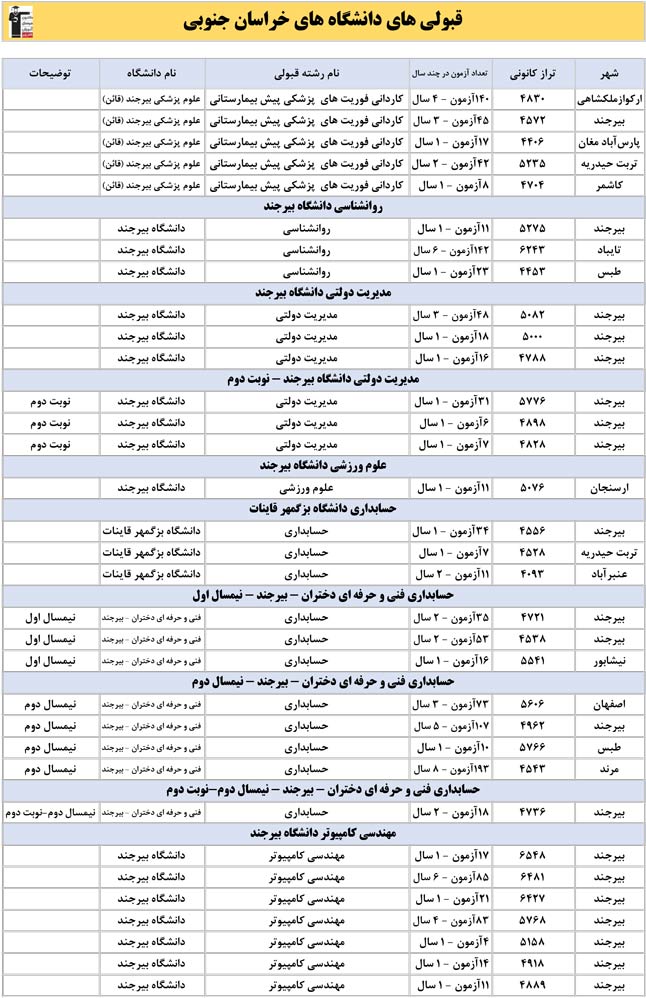 این آمار و اطلاعات مربوط به رشته های دانشگاه های استان خراسان جنوبی و دانش آموزان دو سال قبل کانون(کنکور1401 و 1402) می باشد .شما می توانید نمره ی تراز خود را پیدا کنید و متوجه شوید ، آن ها که پارسال ترازشان مثل شما بوده چه رشته هایی قبول شدند.