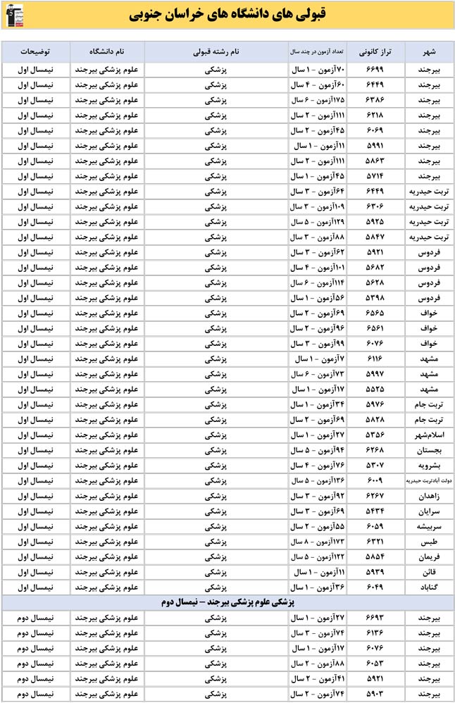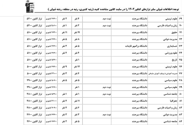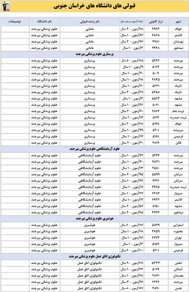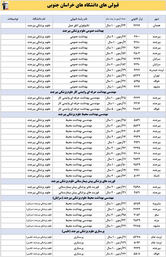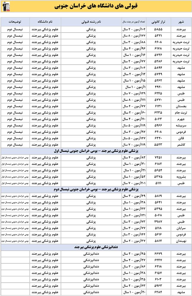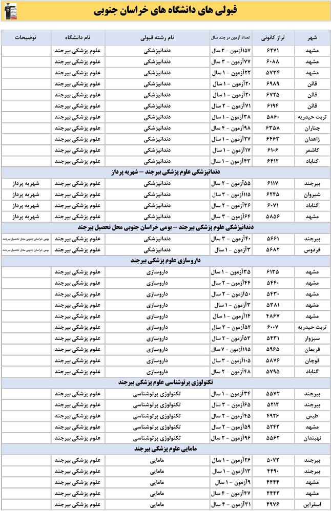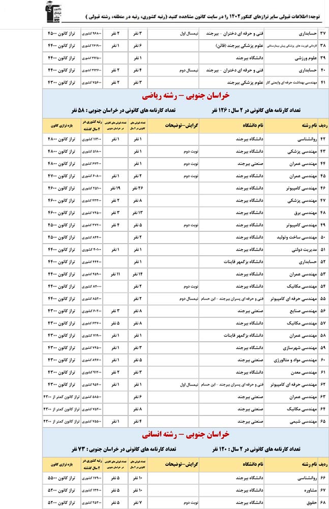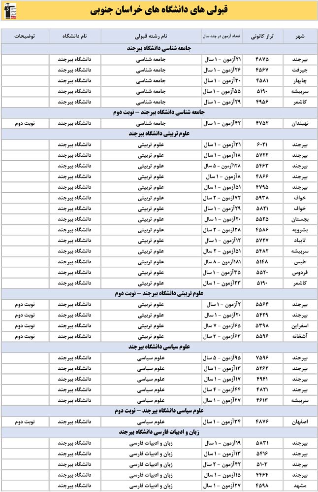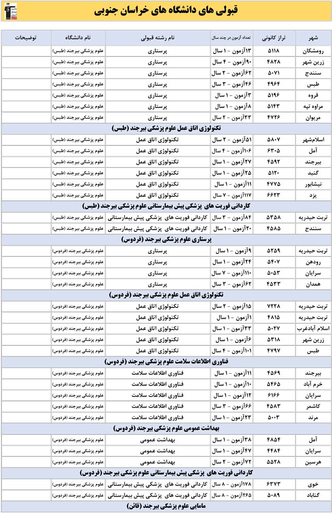 این آمار و اطلاعات مربوط به رشته های دانشگاه های استان خراسان جنوبی و دانش آموزان دو سال قبل کانون(کنکور1401 و 1402) می باشد .شما می توانید نمره ی تراز خود را پیدا کنید و متوجه شوید ، آن ها که پارسال ترازشان مثل شما بوده چه رشته هایی قبول شدند.