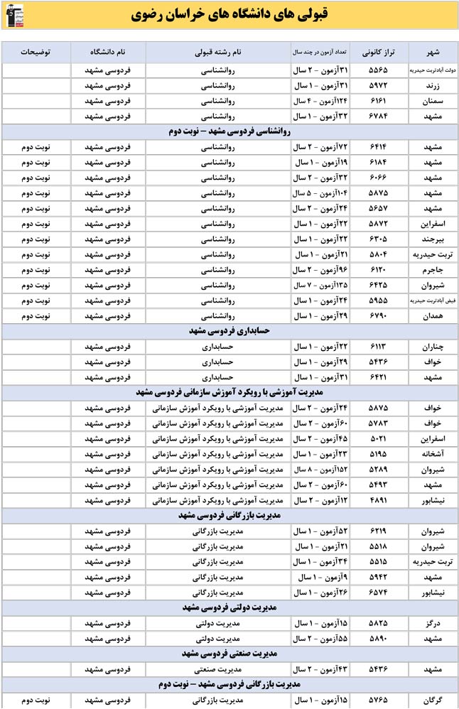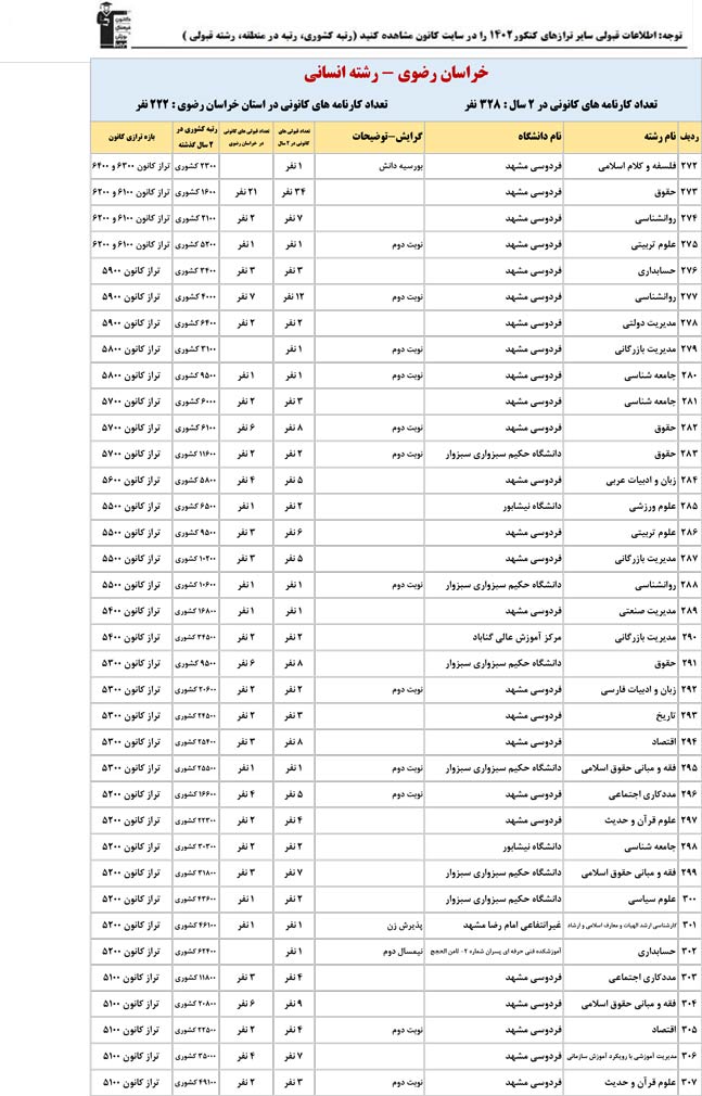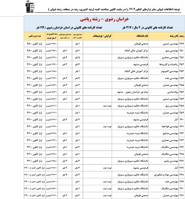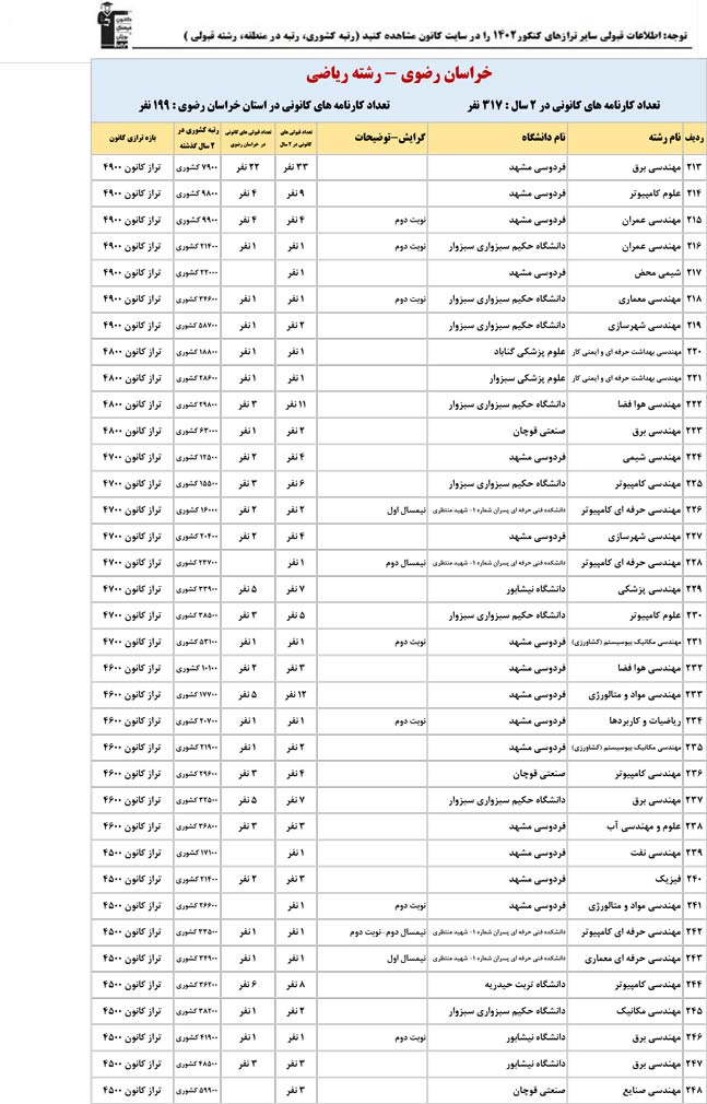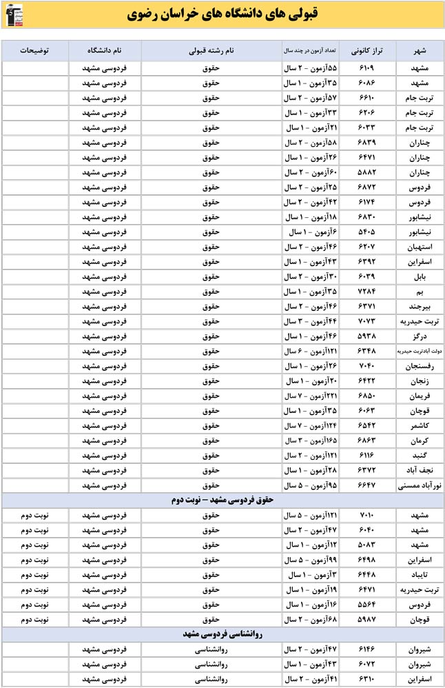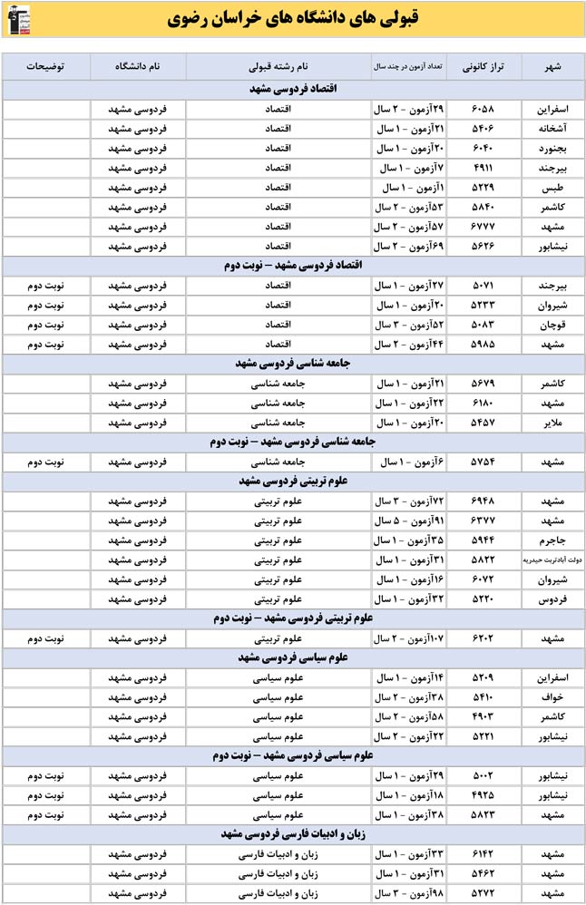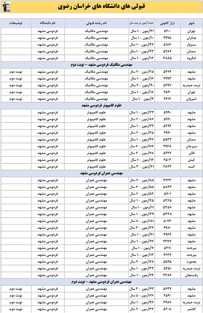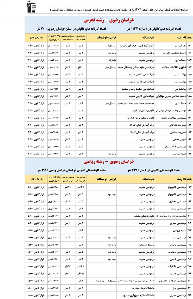این آمار و اطلاعات مربوط به رشته های دانشگاه های استان خراسان رضوی و دانش آموزان دو سال قبل کانون(کنکور1401 و 1402) می باشد .شما می توانید نمره ی تراز خود را پیدا کنید و متوجه شوید ، آن ها که پارسال ترازشان مثل شما بوده چه رشته هایی قبول شدند.