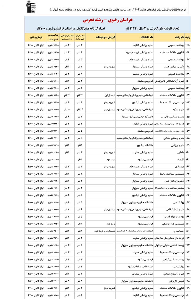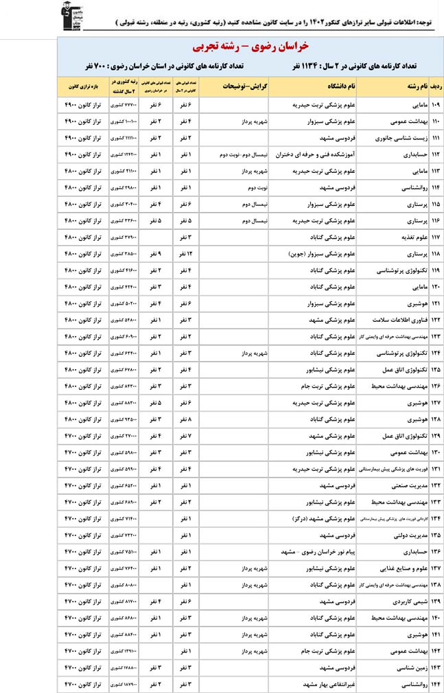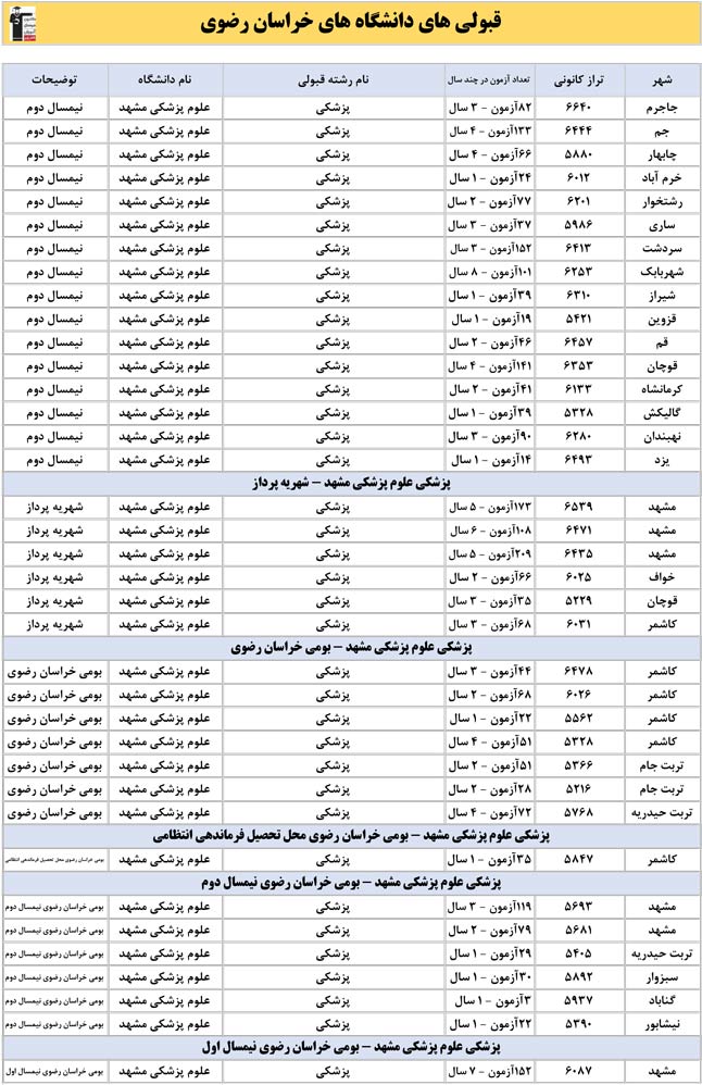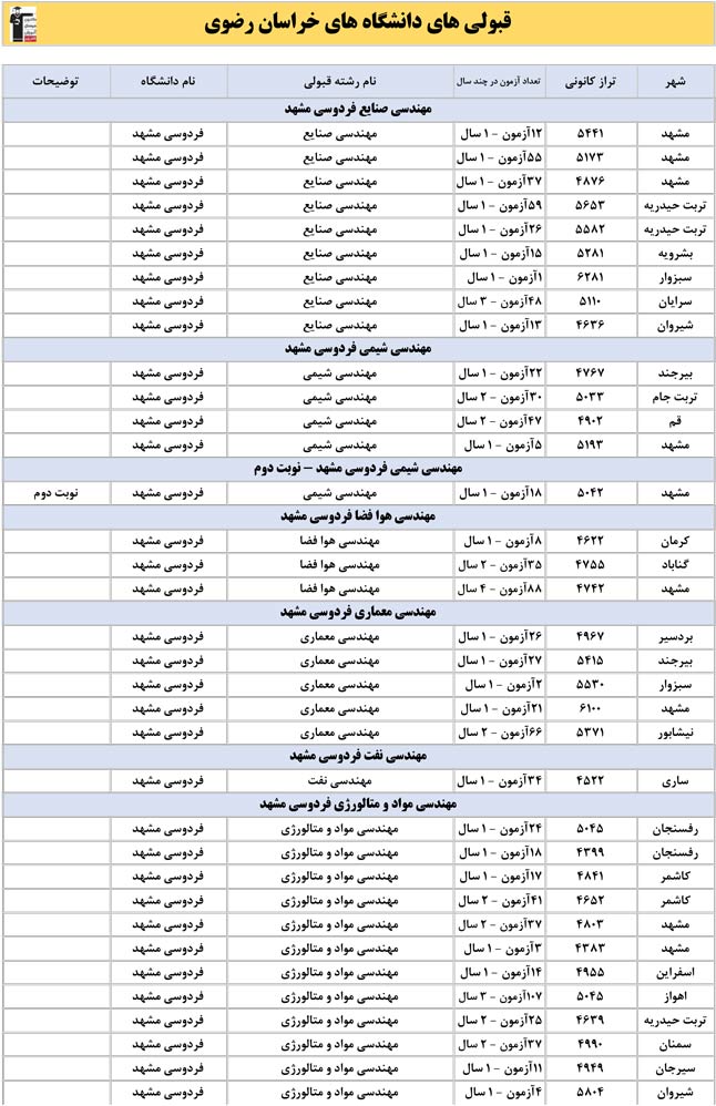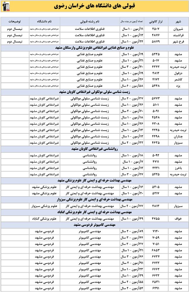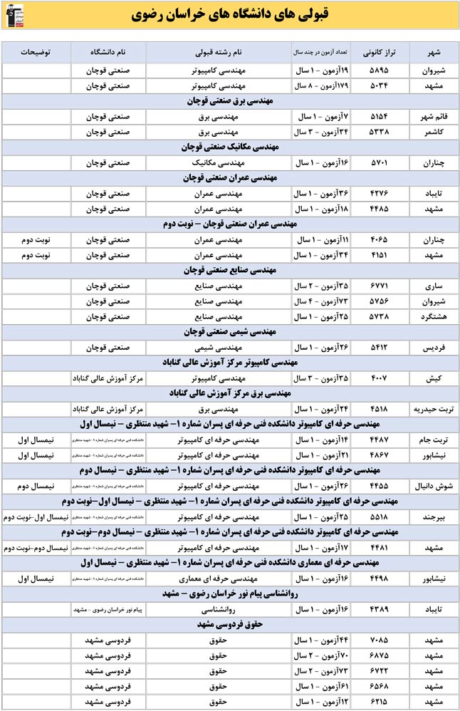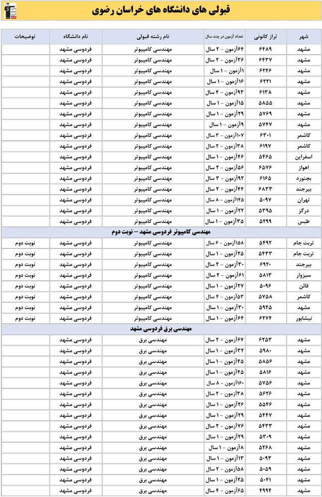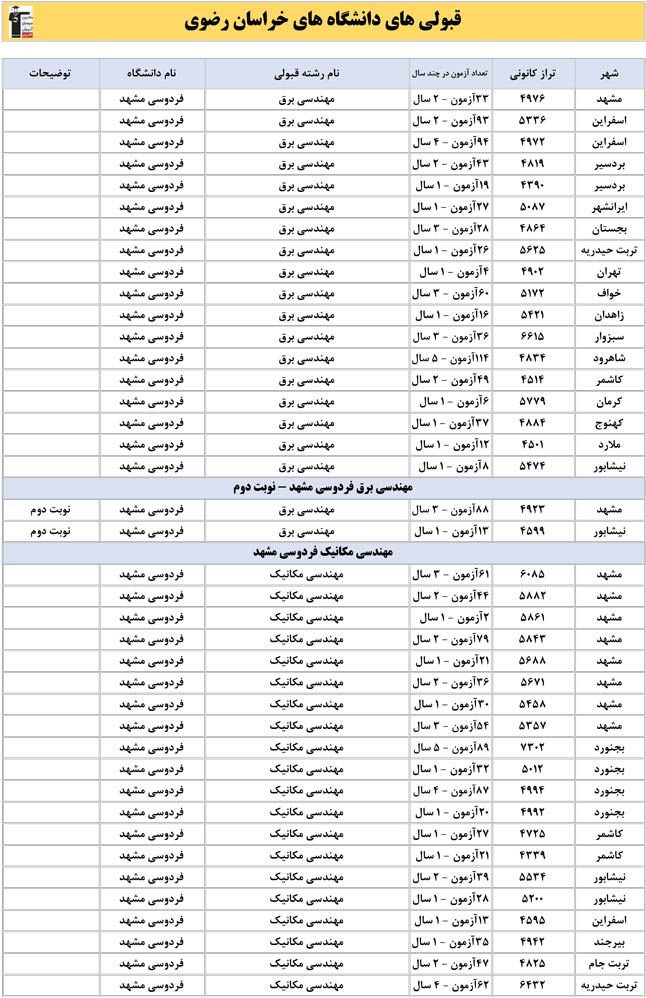این آمار و اطلاعات مربوط به رشته های دانشگاه های استان خراسان رضوی و دانش آموزان دو سال قبل کانون(کنکور1401 و 1402) می باشد .شما می توانید نمره ی تراز خود را پیدا کنید و متوجه شوید ، آن ها که پارسال ترازشان مثل شما بوده چه رشته هایی قبول شدند.