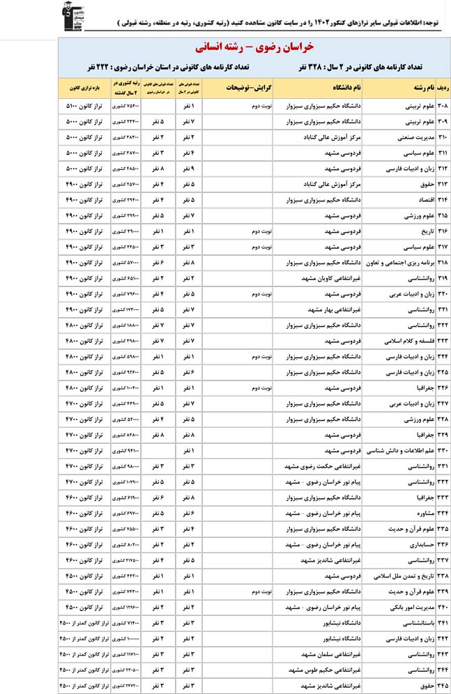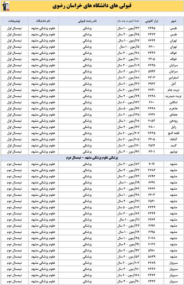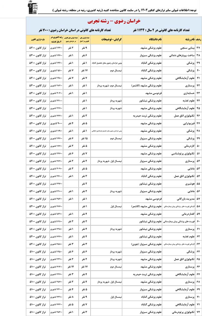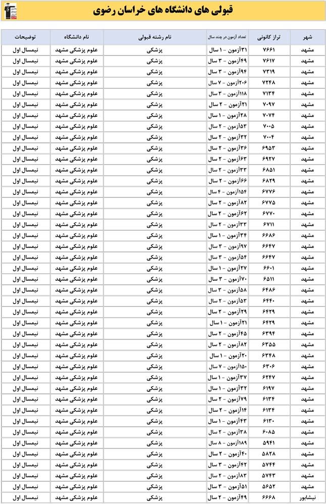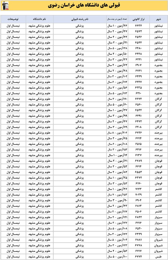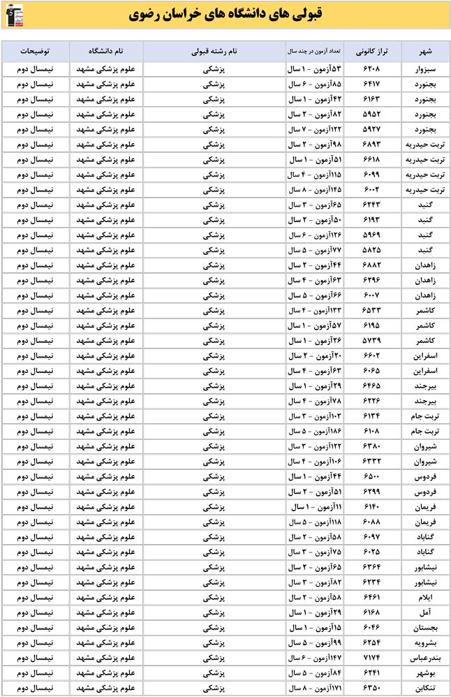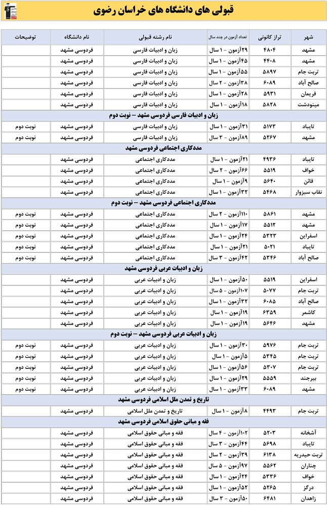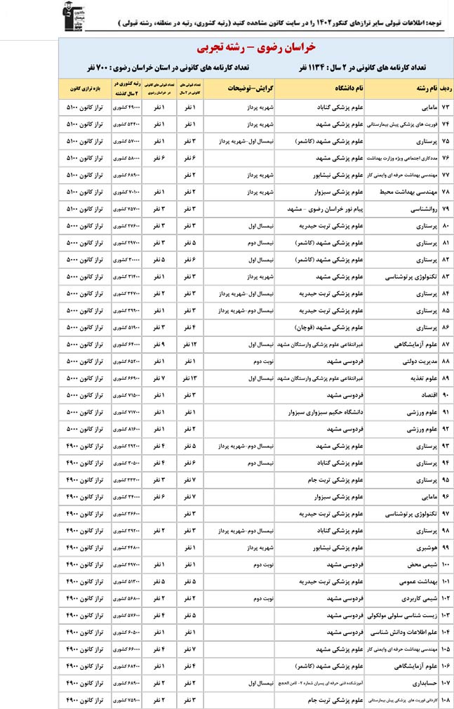 این آمار و اطلاعات مربوط به رشته های دانشگاه های استان خراسان رضوی و دانش آموزان دو سال قبل کانون(کنکور1401 و 1402) می باشد .شما می توانید نمره ی تراز خود را پیدا کنید و متوجه شوید ، آن ها که پارسال ترازشان مثل شما بوده چه رشته هایی قبول شدند.