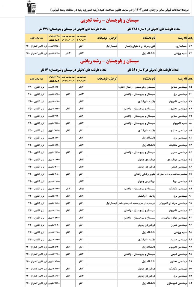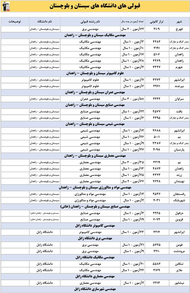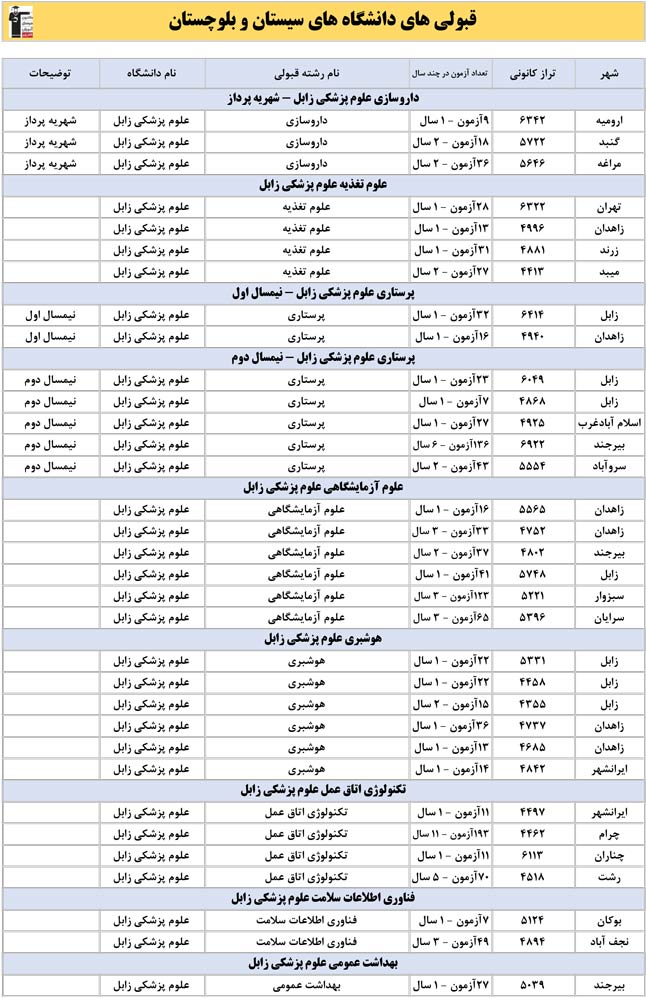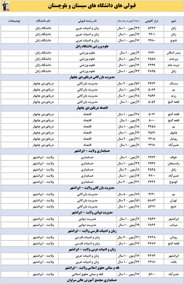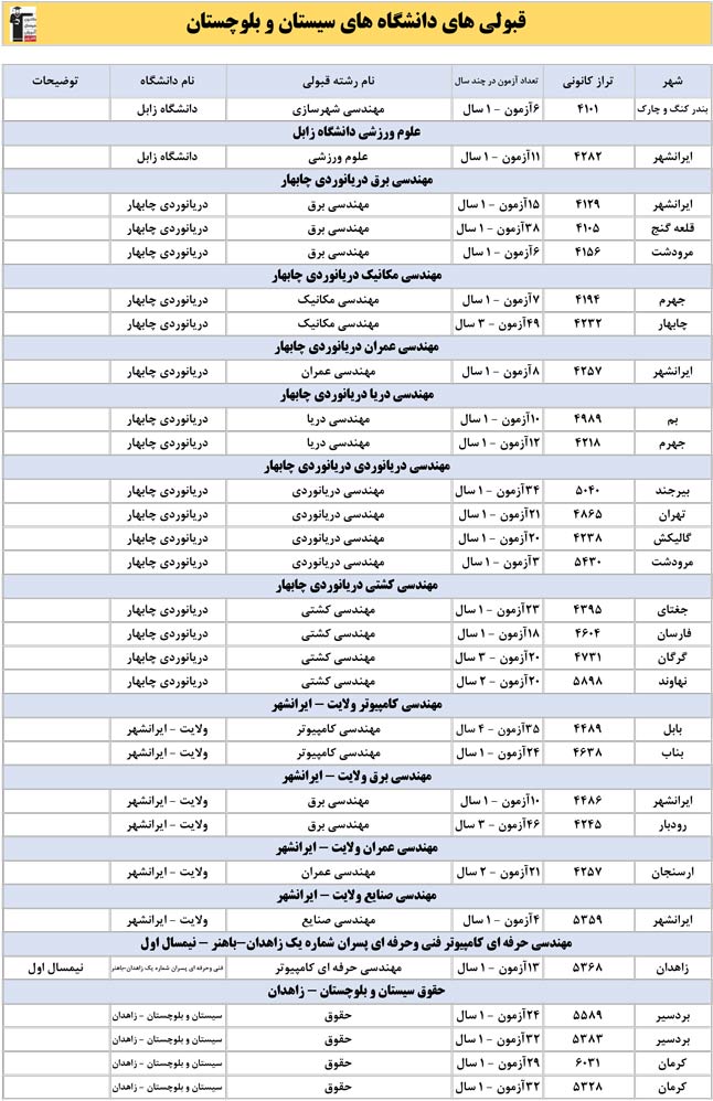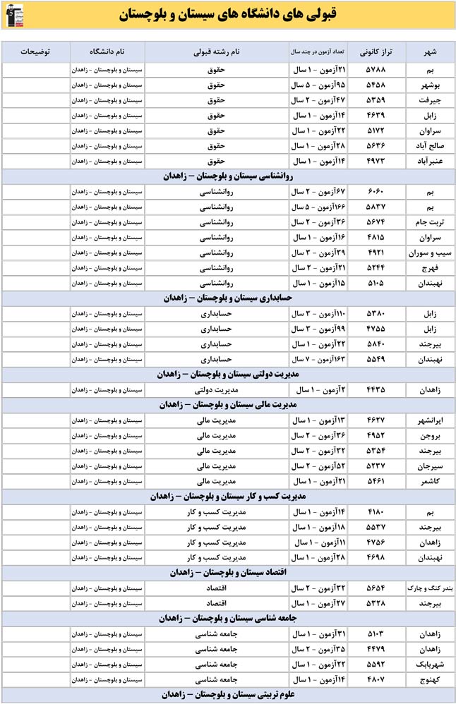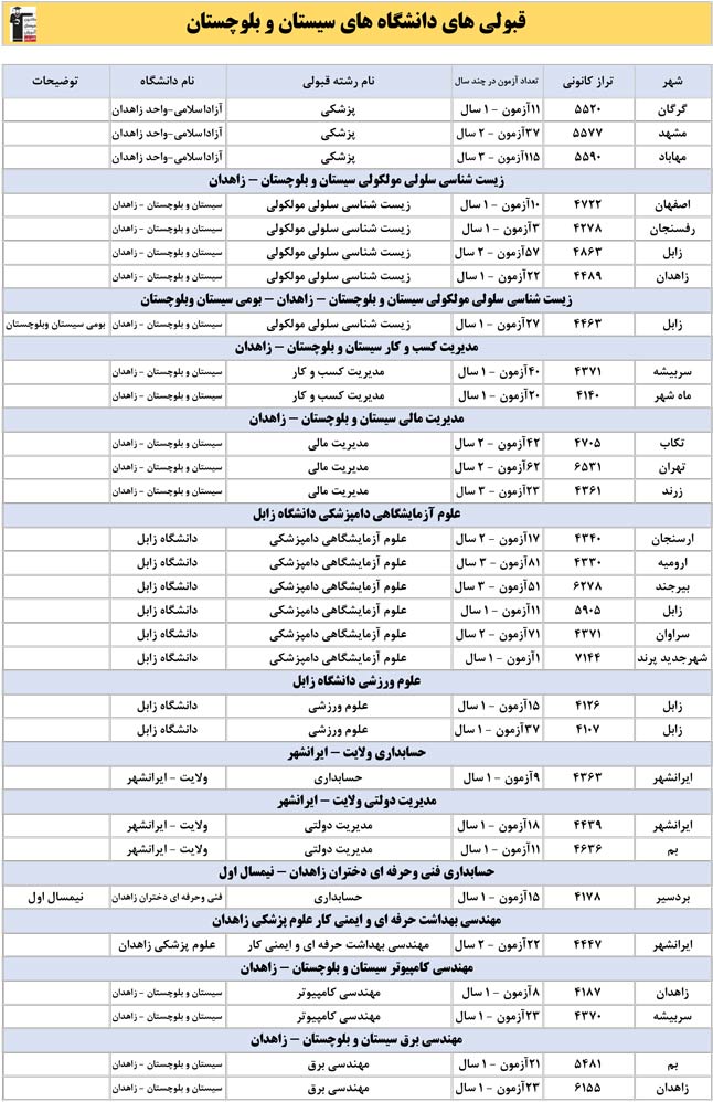 این آمار و اطلاعات مربوط به رشته های دانشگاه های استان سیستان و بلوچستان و دانش آموزان دو سال قبل کانون(کنکور1401 و 1402) می باشد .شما می توانید نمره ی تراز خود را پیدا کنید و متوجه شوید ، آن ها که پارسال ترازشان مثل شما بوده چه رشته هایی قبول شدند.