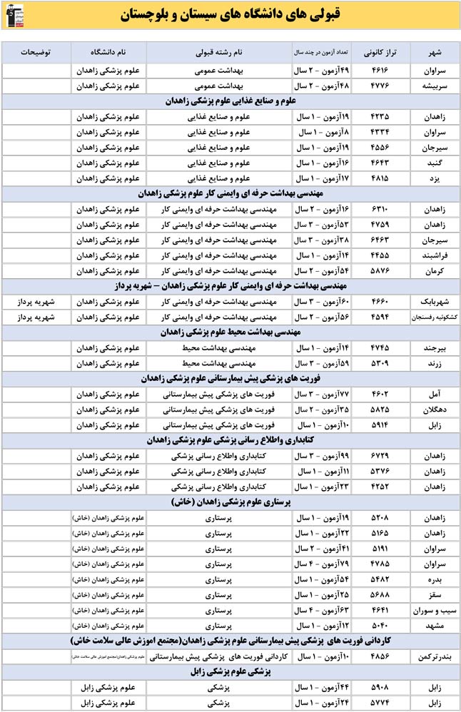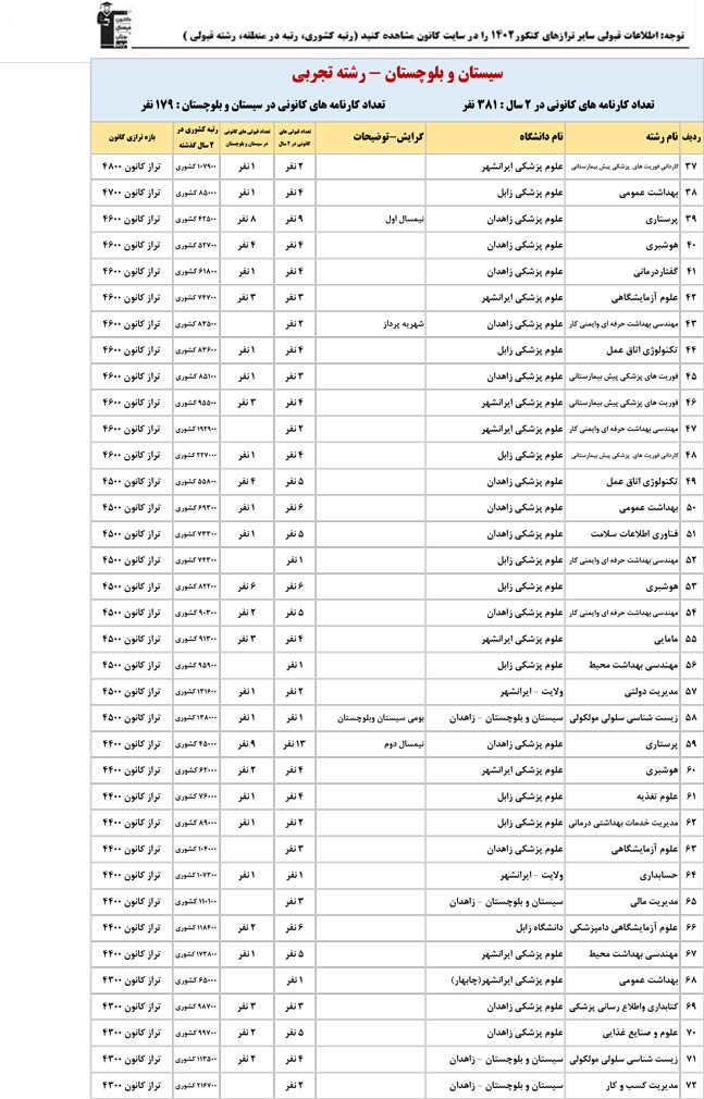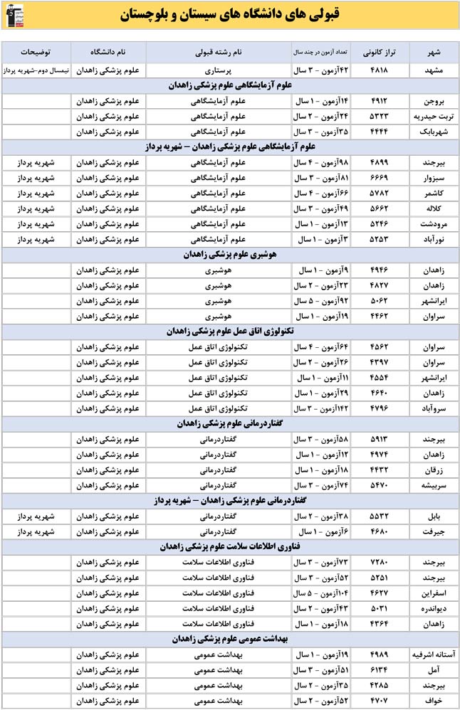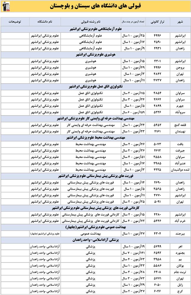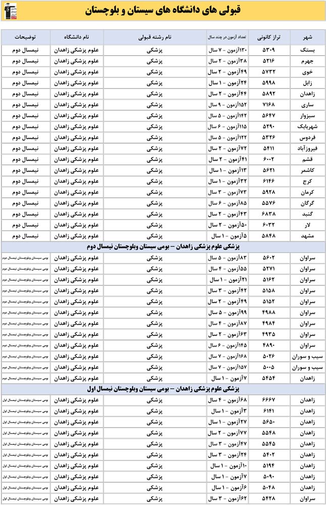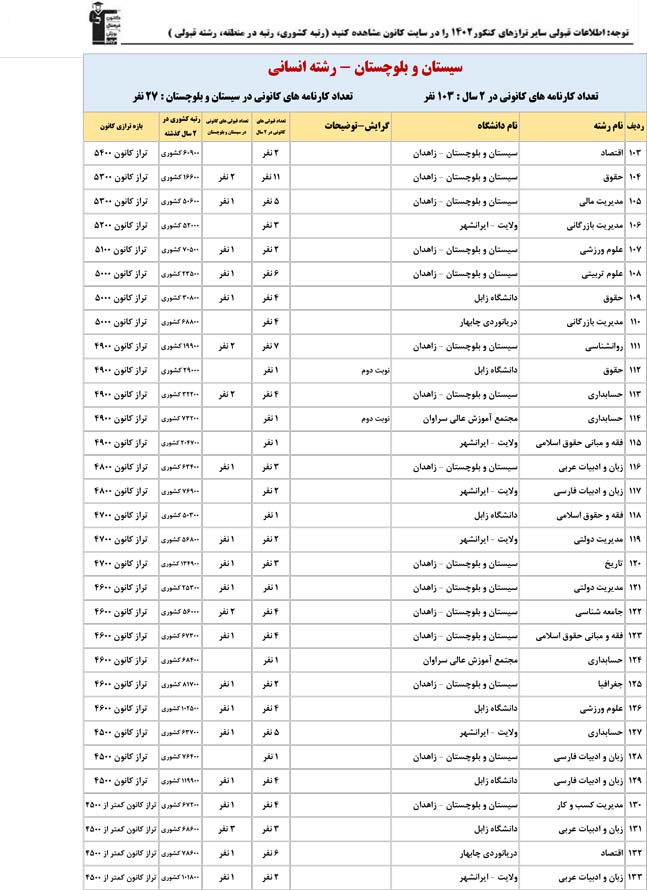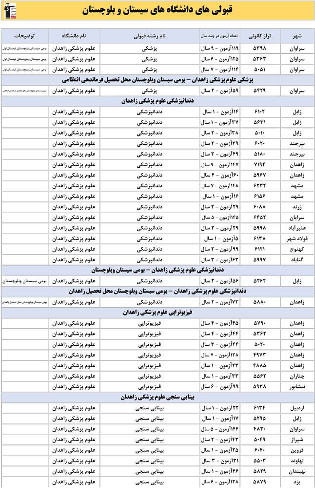 این آمار و اطلاعات مربوط به رشته های دانشگاه های استان سیستان و بلوچستان و دانش آموزان دو سال قبل کانون(کنکور1401 و 1402) می باشد .شما می توانید نمره ی تراز خود را پیدا کنید و متوجه شوید ، آن ها که پارسال ترازشان مثل شما بوده چه رشته هایی قبول شدند.