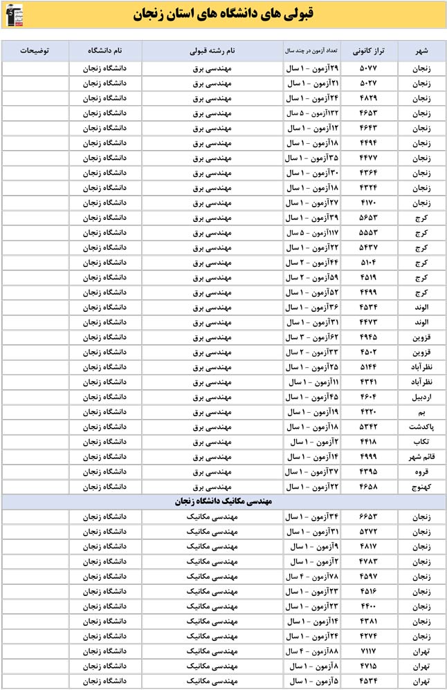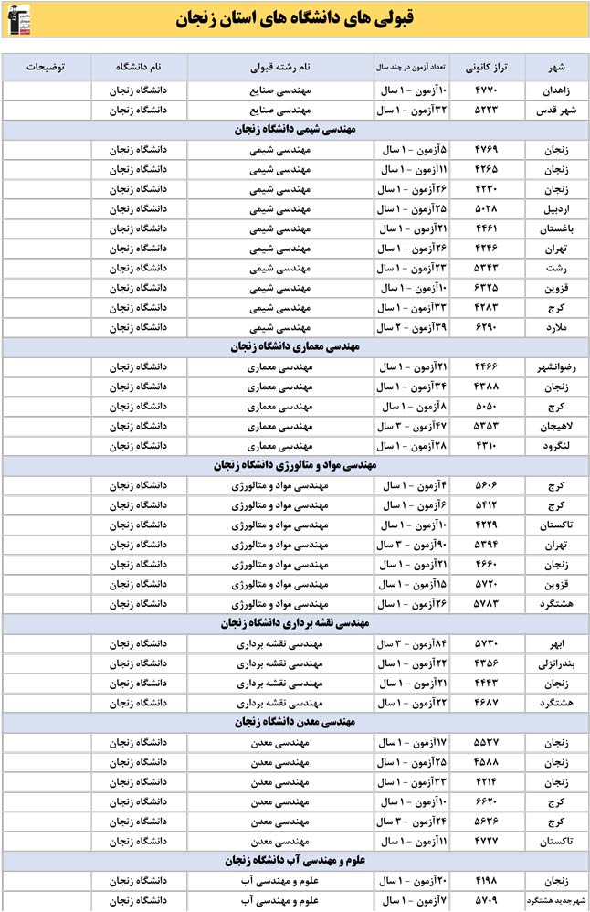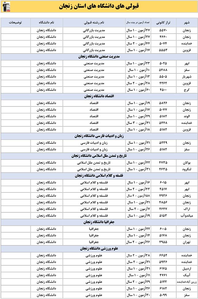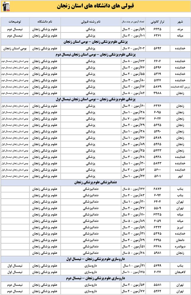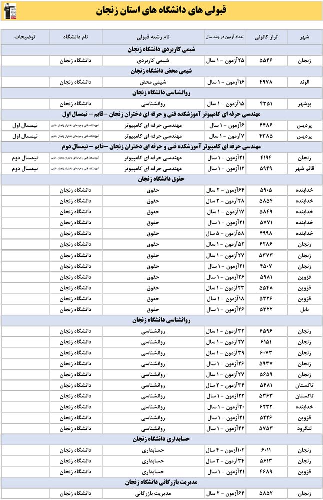 این آمار و اطلاعات مربوط به رشته های دانشگاه های استان زنجان و دانش آموزان دو سال قبل کانون(کنکور1401 و 1402) می باشد .شما می توانید نمره ی تراز خود را پیدا کنید و متوجه شوید ، آن ها که پارسال ترازشان مثل شما بوده چه رشته هایی قبول شدند.
