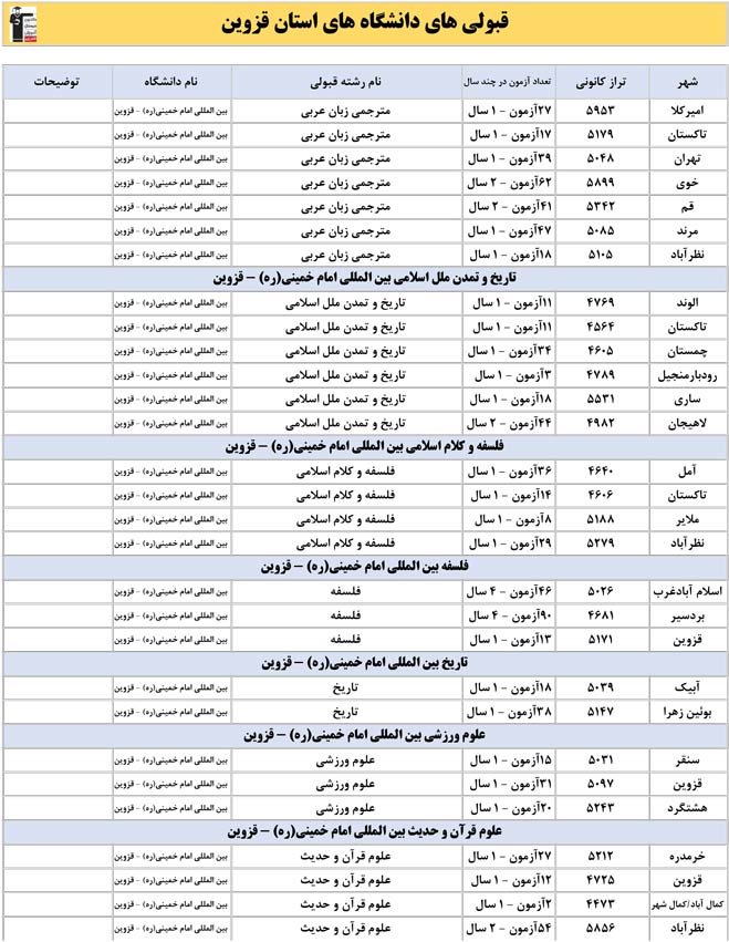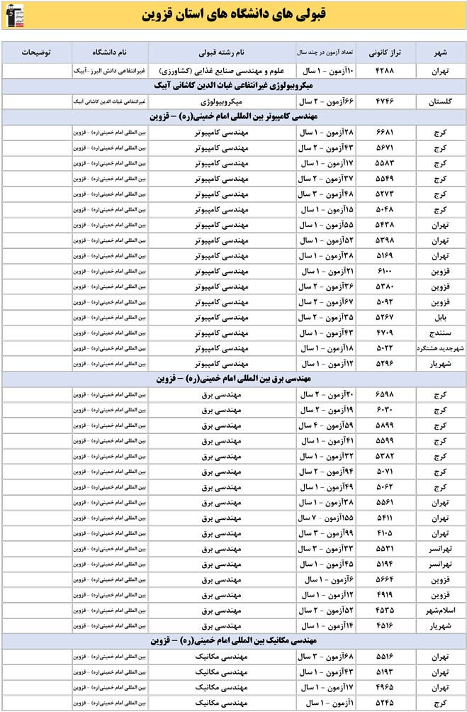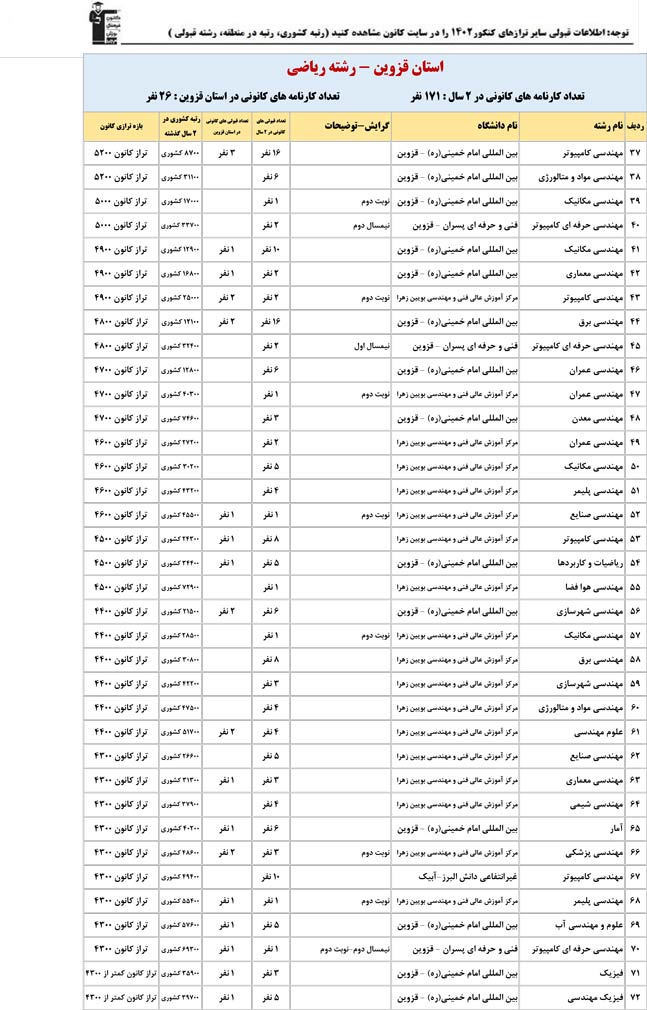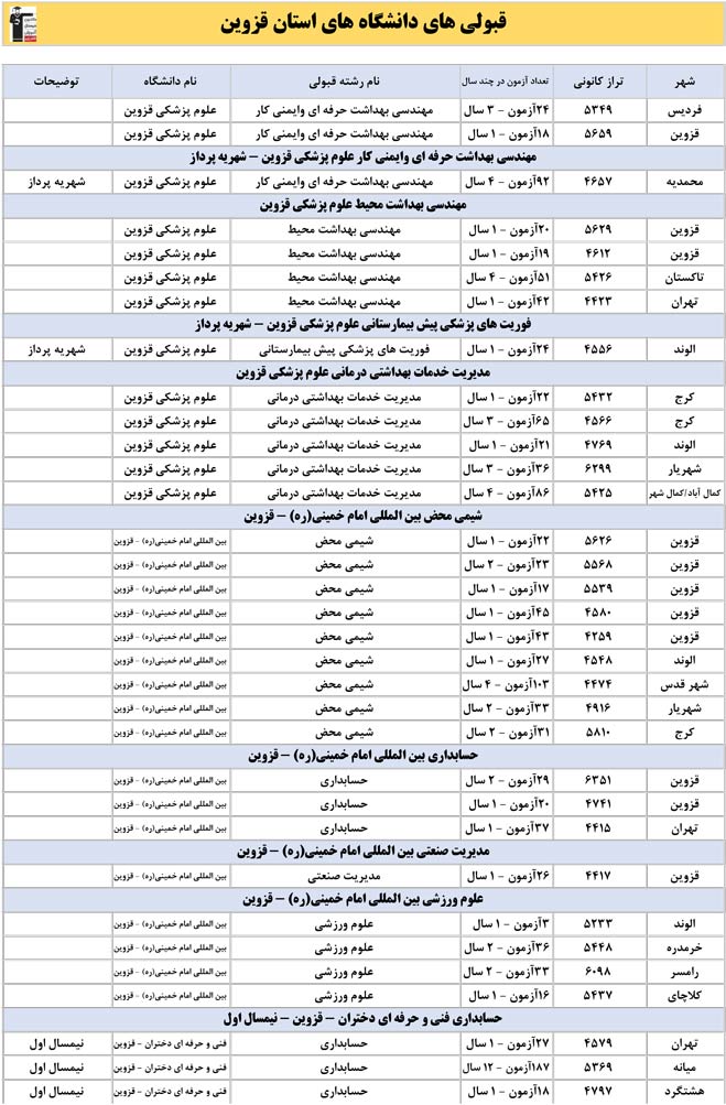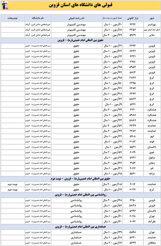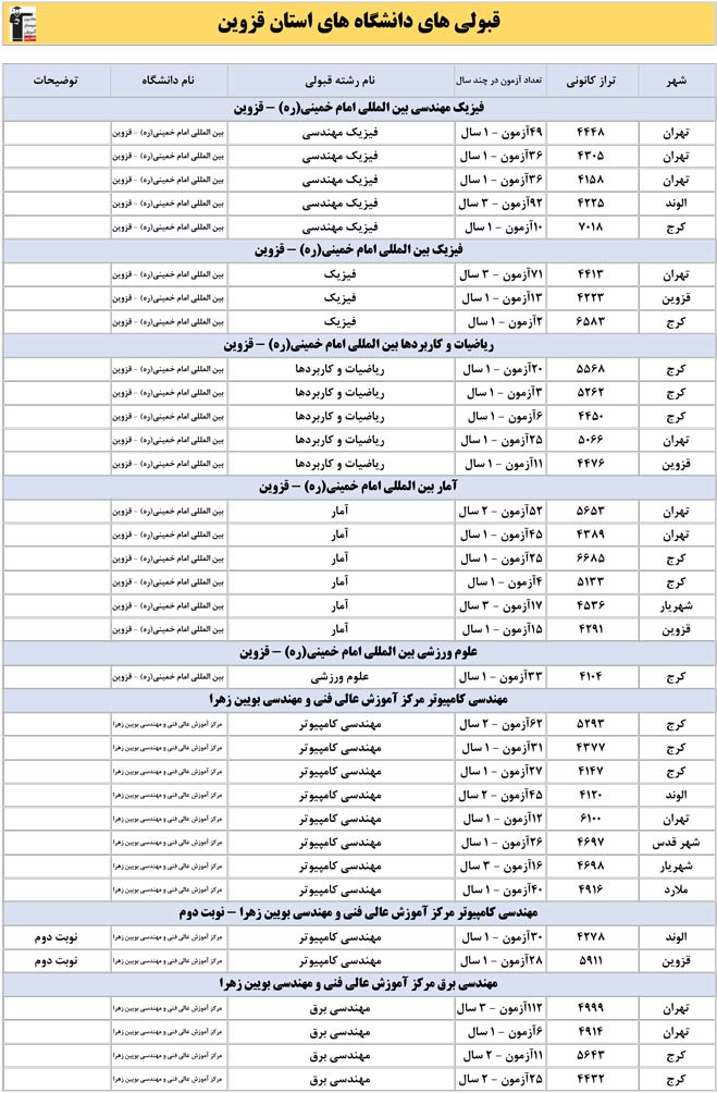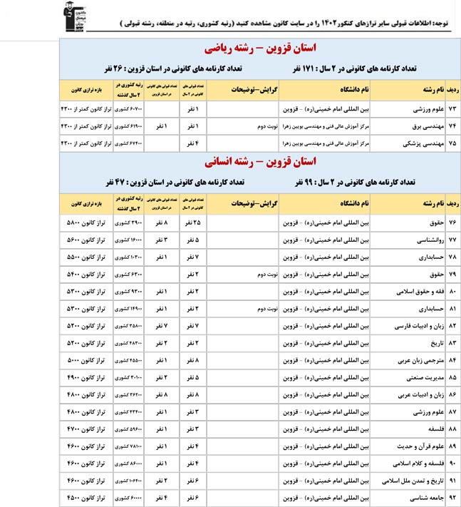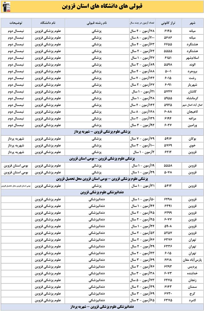 این آمار و اطلاعات مربوط به رشته های دانشگاه های استان قزوین و دانش آموزان دو سال قبل کانون(کنکور1401 و 1402) می باشد .شما می توانید نمره ی تراز خود را پیدا کنید و متوجه شوید ، آن ها که پارسال ترازشان مثل شما بوده چه رشته هایی قبول شدند.