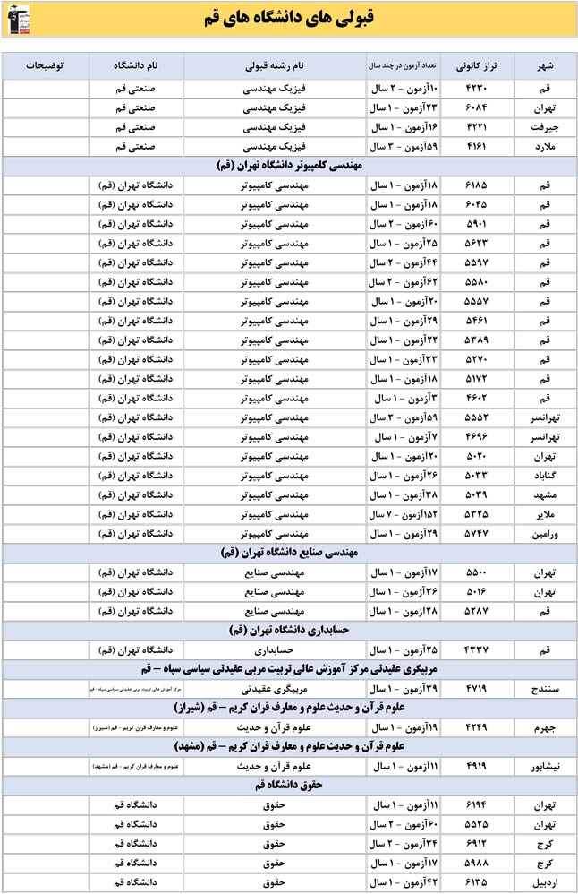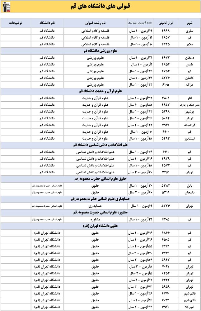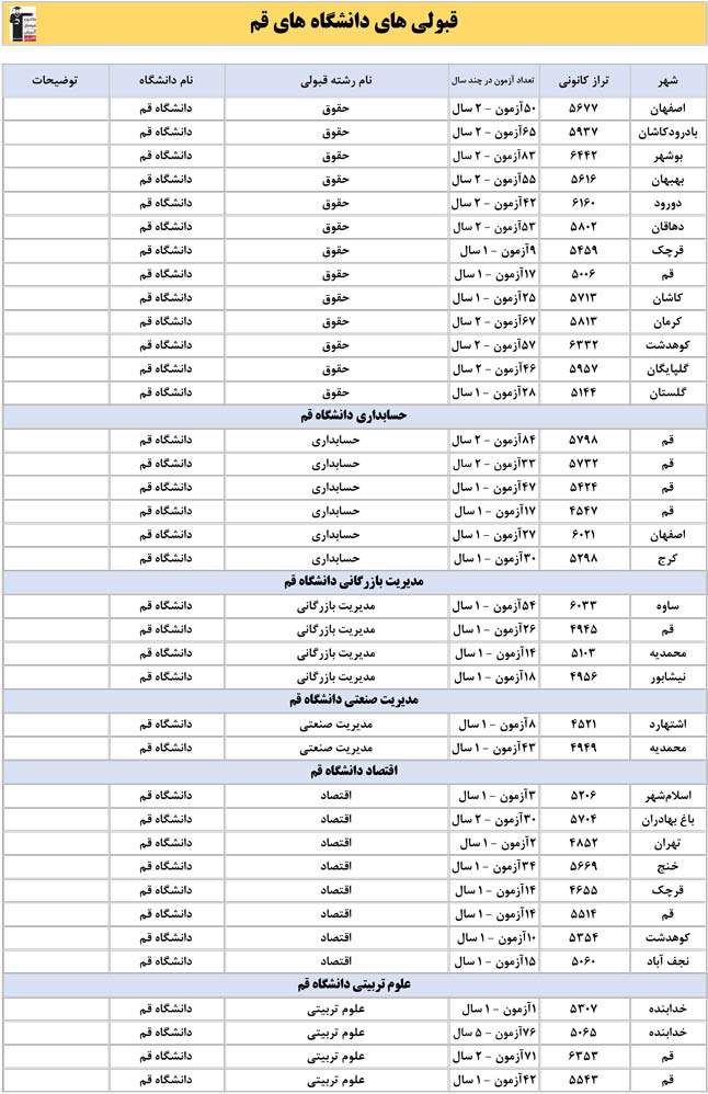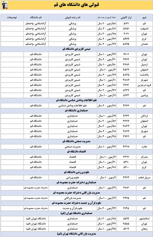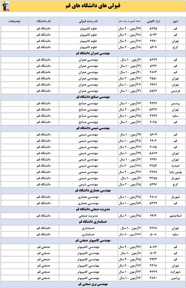 این آمار و اطلاعات مربوط به رشته های دانشگاه های استان قم و دانش آموزان دو سال قبل کانون(کنکور1401 و 1402) می باشد .شما می توانید نمره ی تراز خود را پیدا کنید و متوجه شوید ، آن ها که پارسال ترازشان مثل شما بوده چه رشته هایی قبول شدند.
