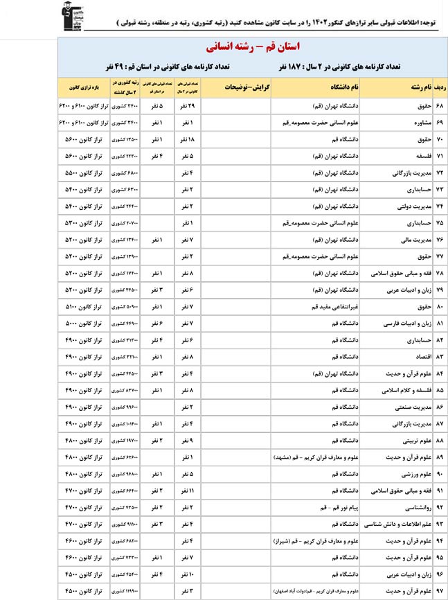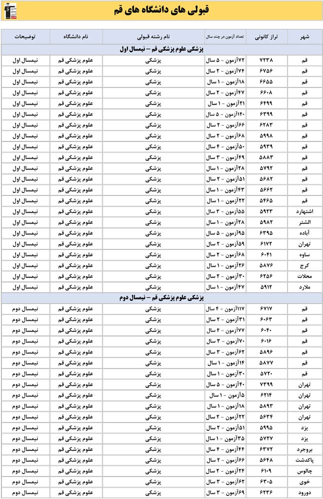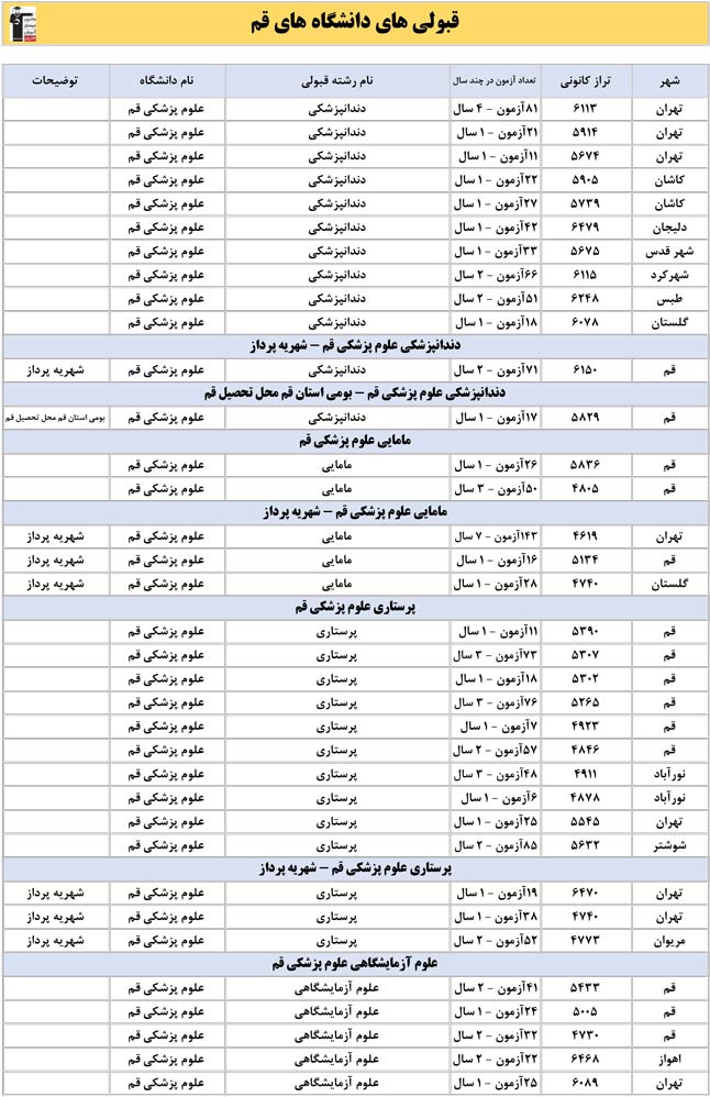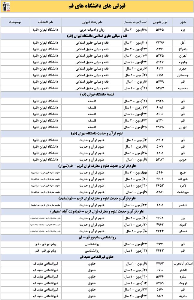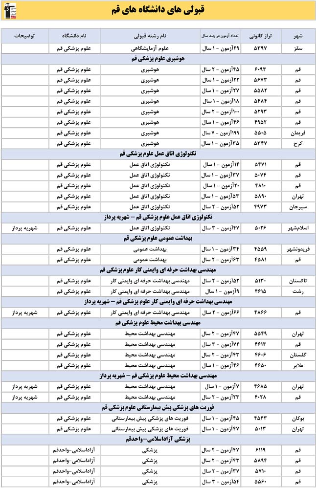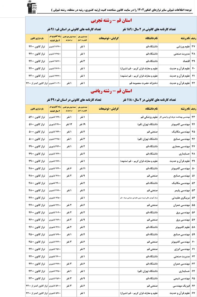 این آمار و اطلاعات مربوط به رشته های دانشگاه های استان قم و دانش آموزان دو سال قبل کانون(کنکور1401 و 1402) می باشد .شما می توانید نمره ی تراز خود را پیدا کنید و متوجه شوید ، آن ها که پارسال ترازشان مثل شما بوده چه رشته هایی قبول شدند.