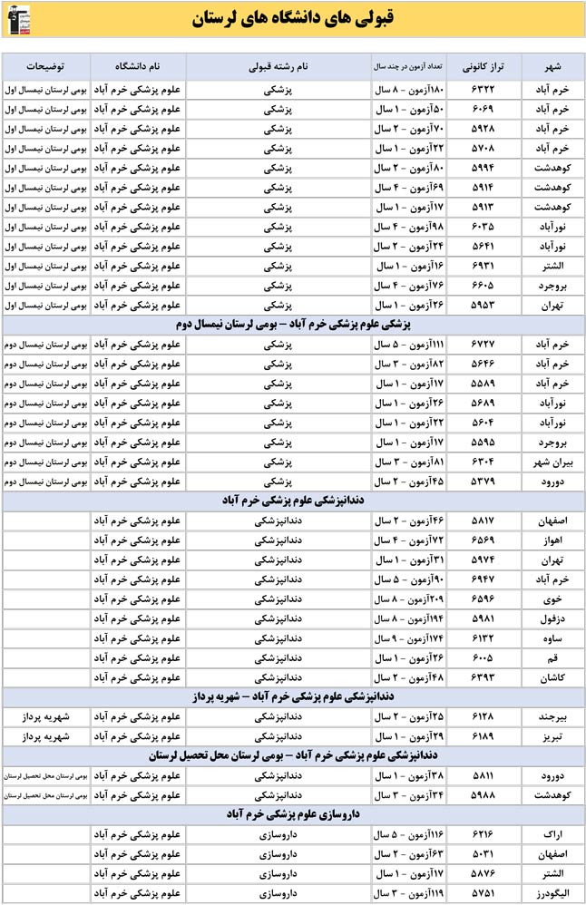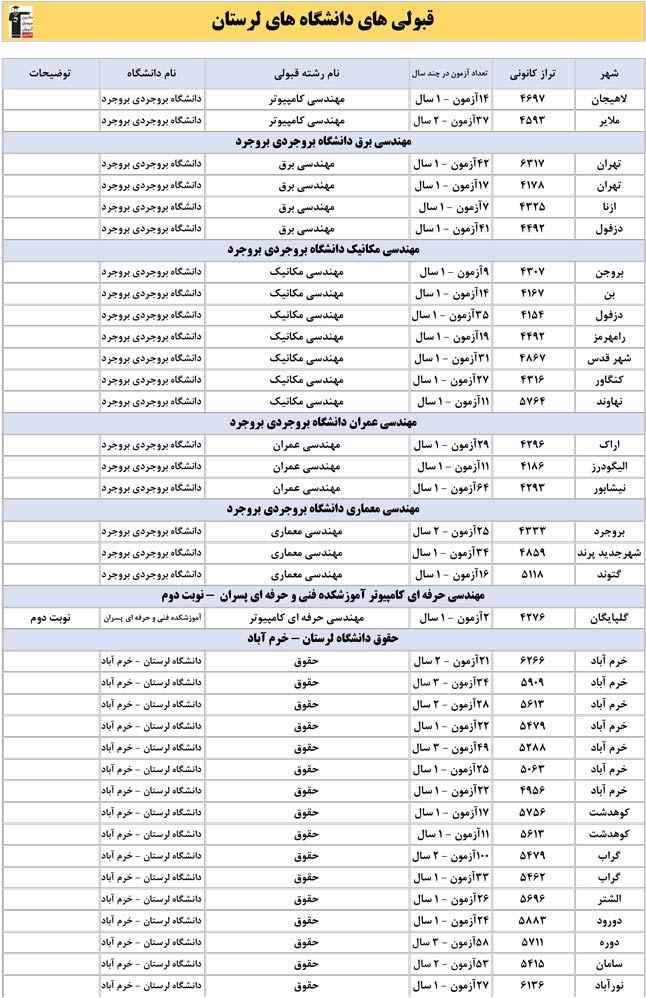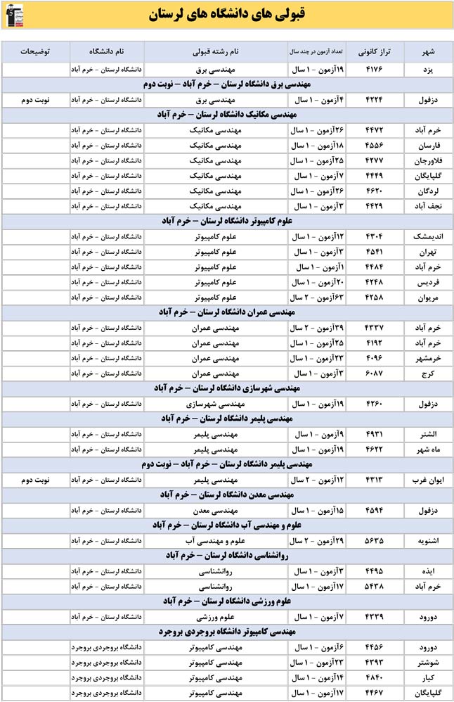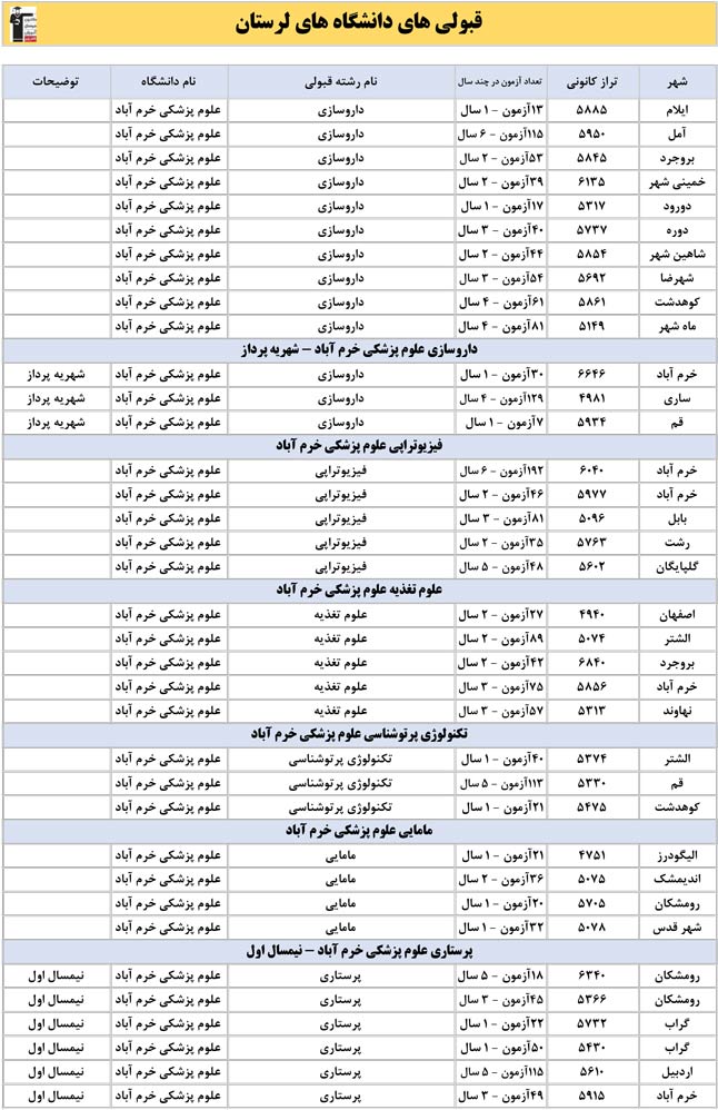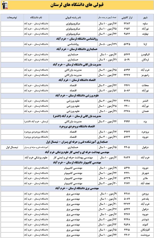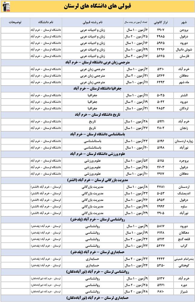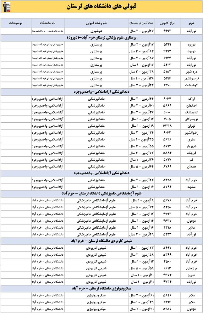 این آمار و اطلاعات مربوط به رشته های دانشگاه های استان لرستان و دانش آموزان دو سال قبل کانون(کنکور1401 و 1402) می باشد .شما می توانید نمره ی تراز خود را پیدا کنید و متوجه شوید ، آن ها که پارسال ترازشان مثل شما بوده چه رشته هایی قبول شدند.