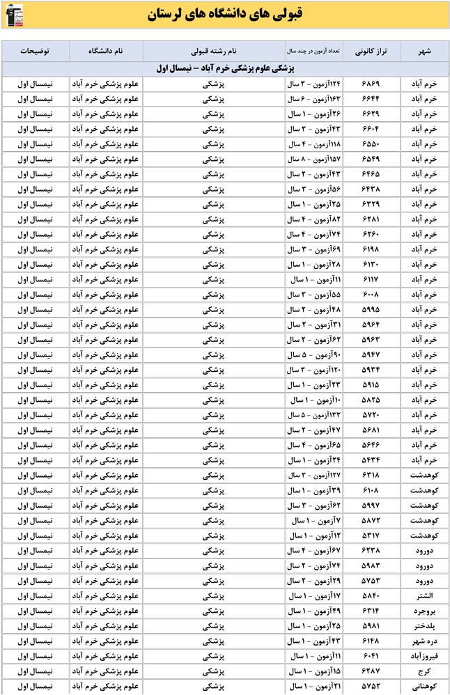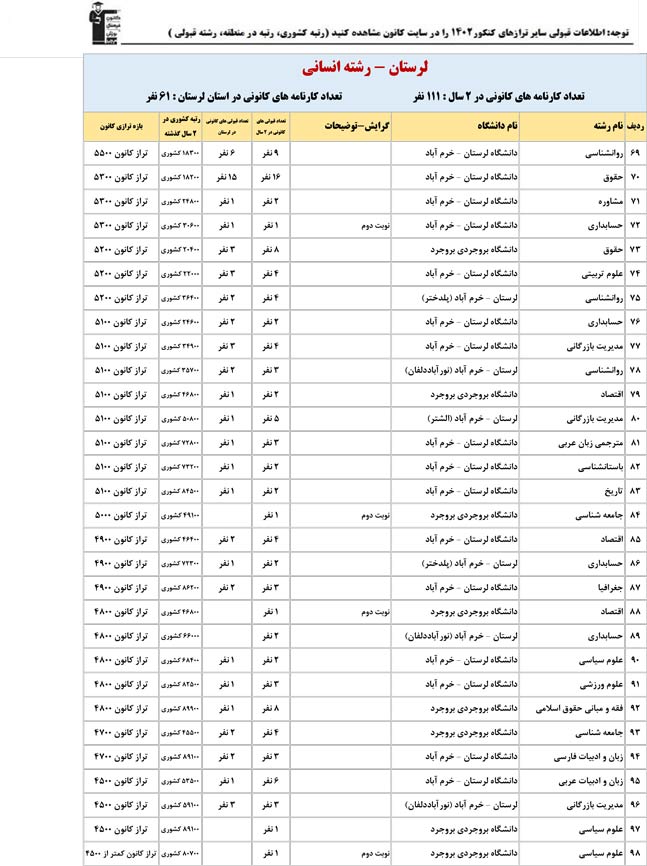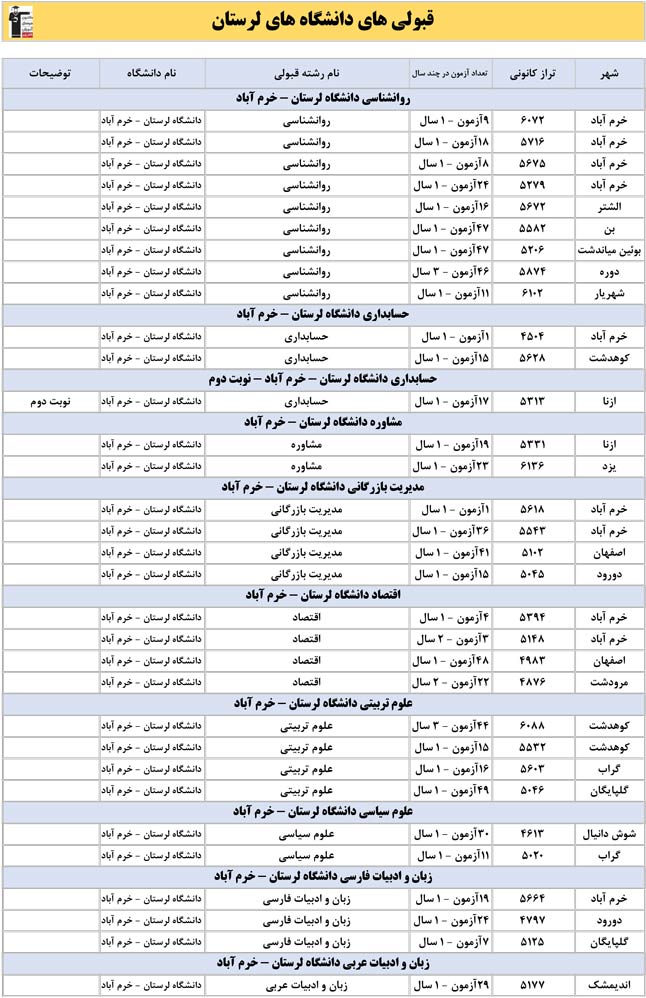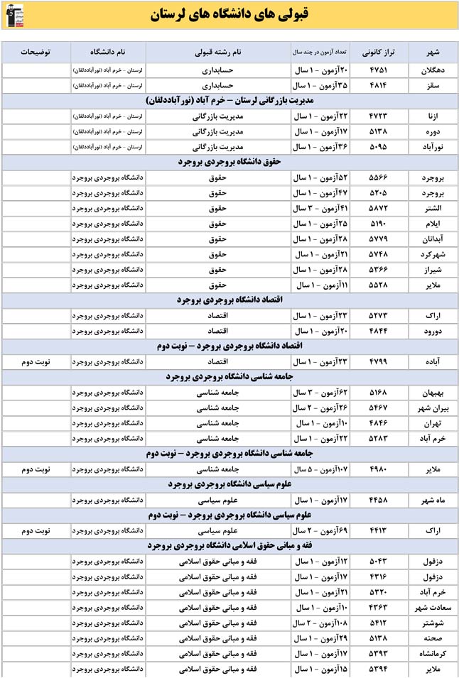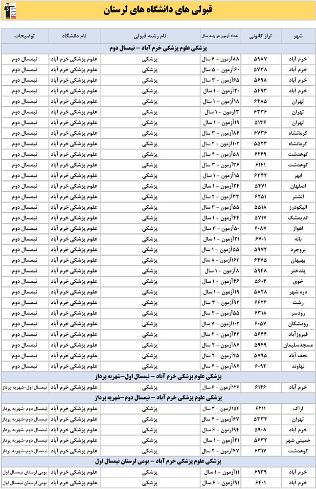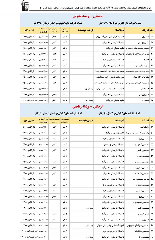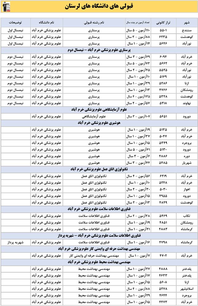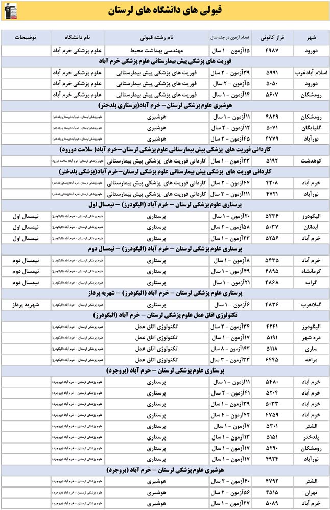 این آمار و اطلاعات مربوط به رشته های دانشگاه های استان لرستان و دانش آموزان دو سال قبل کانون(کنکور1401 و 1402) می باشد .شما می توانید نمره ی تراز خود را پیدا کنید و متوجه شوید ، آن ها که پارسال ترازشان مثل شما بوده چه رشته هایی قبول شدند.