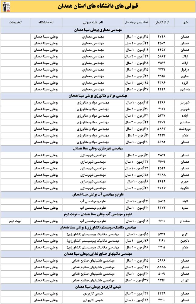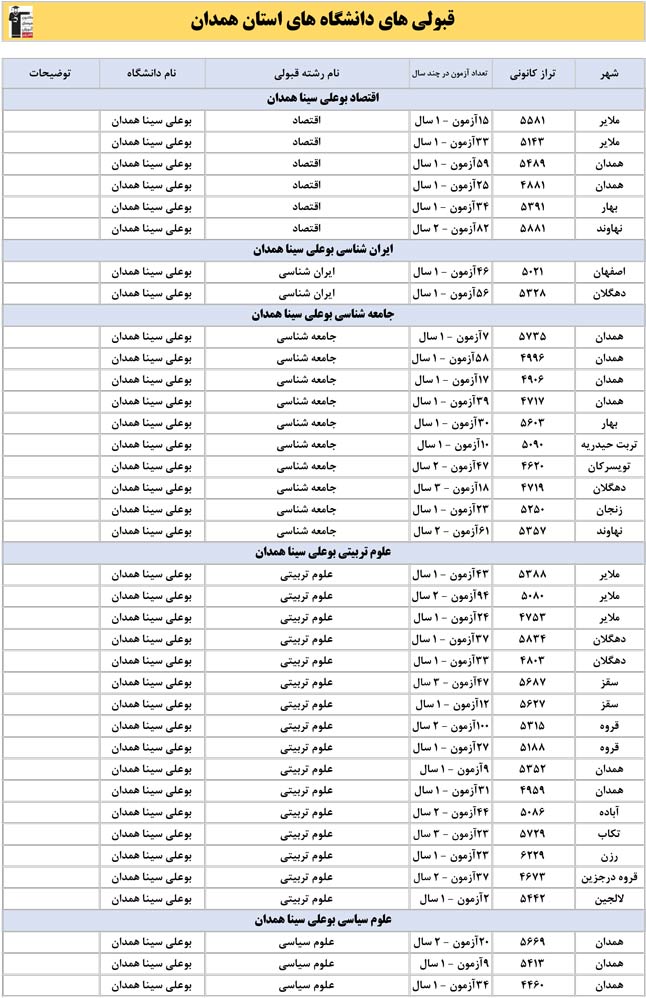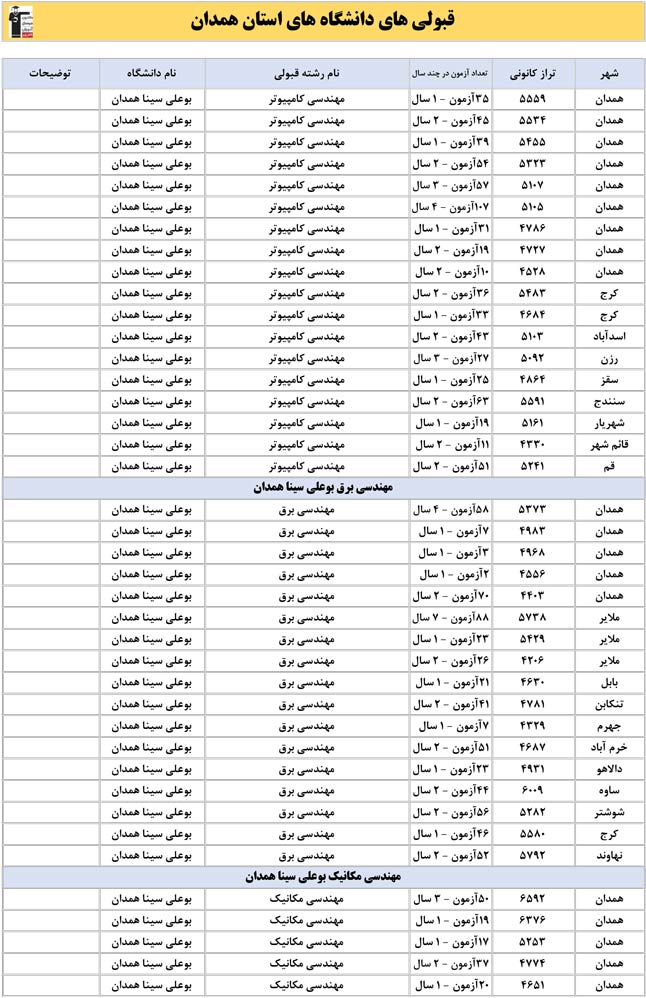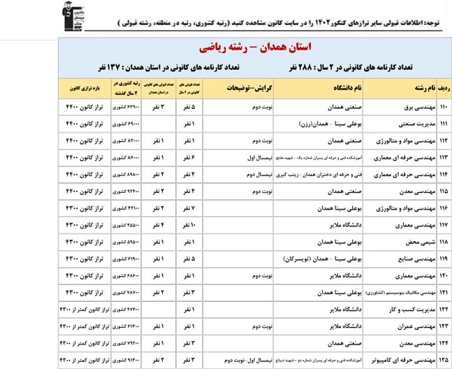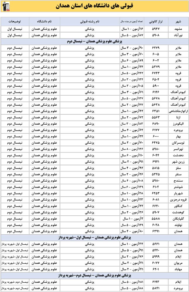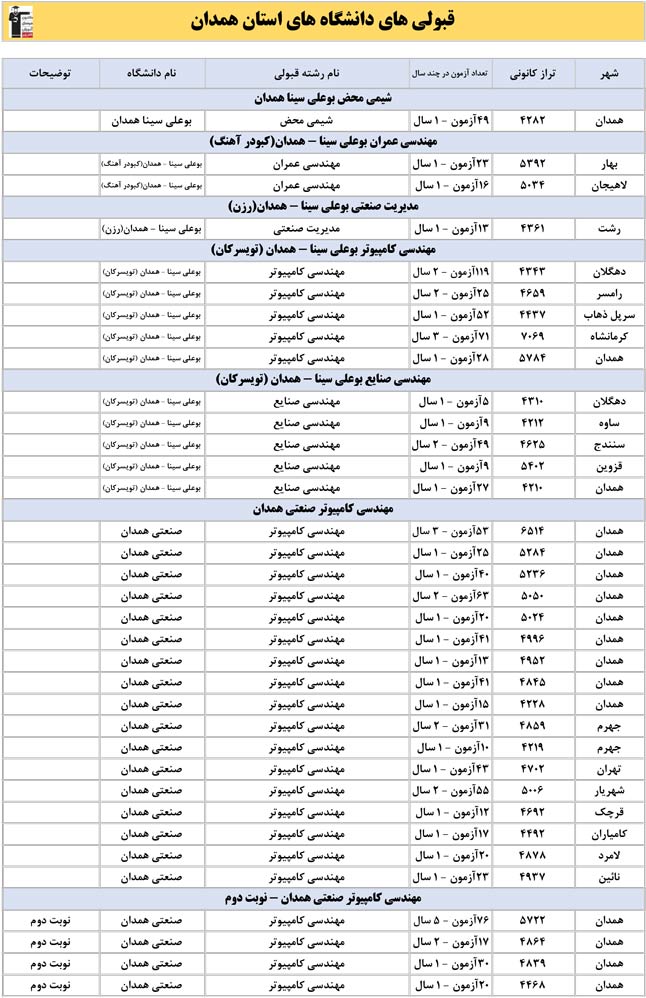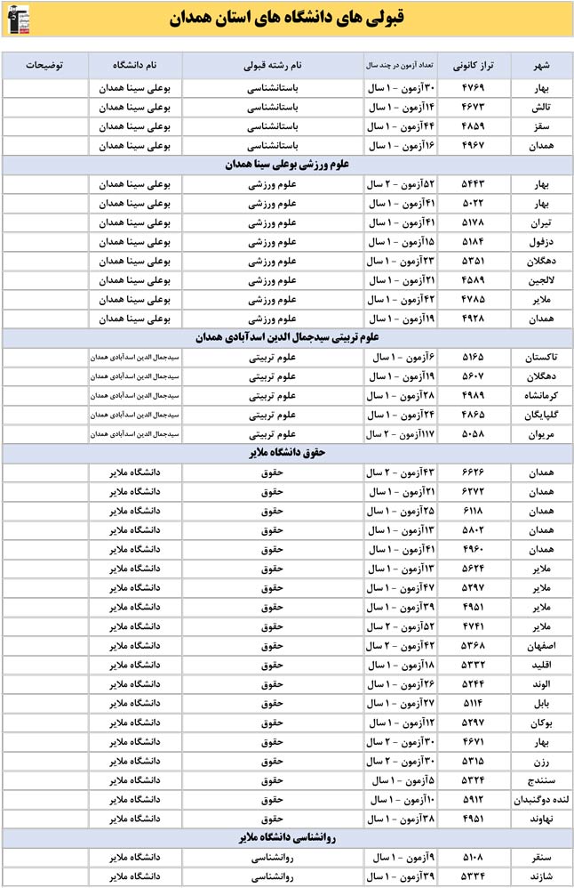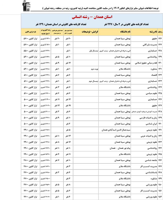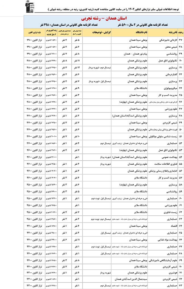 این آمار و اطلاعات مربوط به رشته های دانشگاه های استان همدان و دانش آموزان دو سال قبل کانون(کنکور1401 و 1402) می باشد .شما می توانید نمره ی تراز خود را پیدا کنید و متوجه شوید ، آن ها که پارسال ترازشان مثل شما بوده چه رشته هایی قبول شدند.