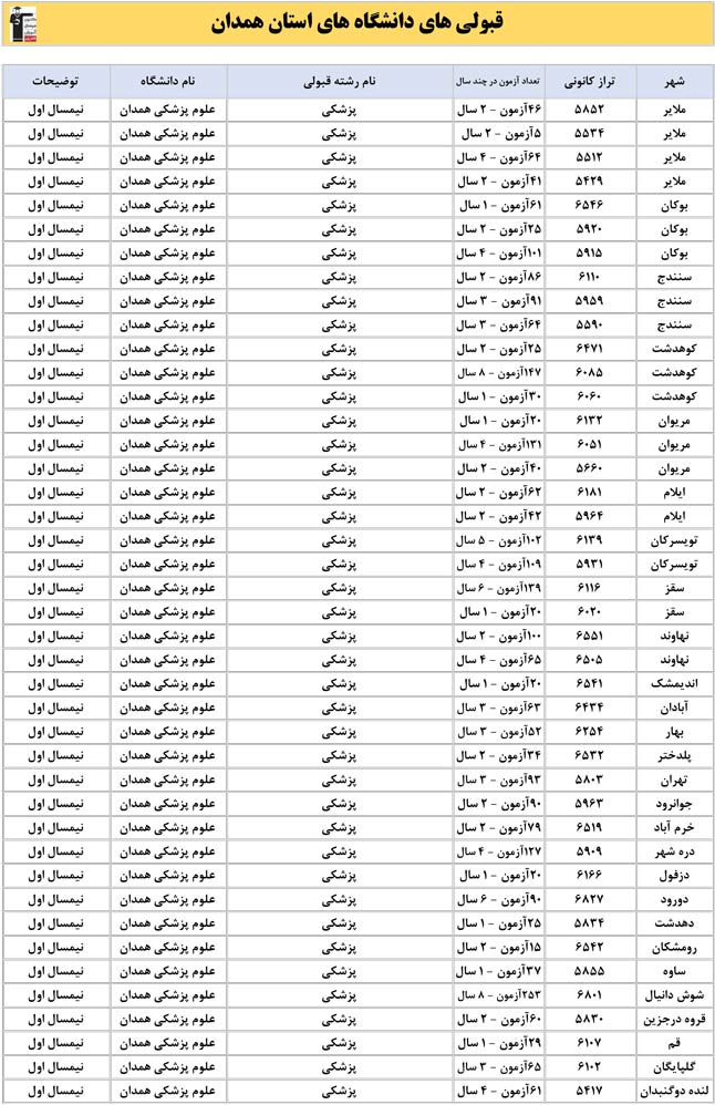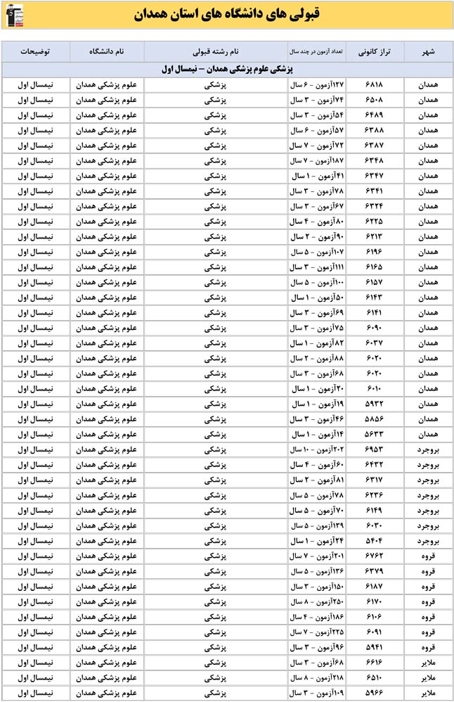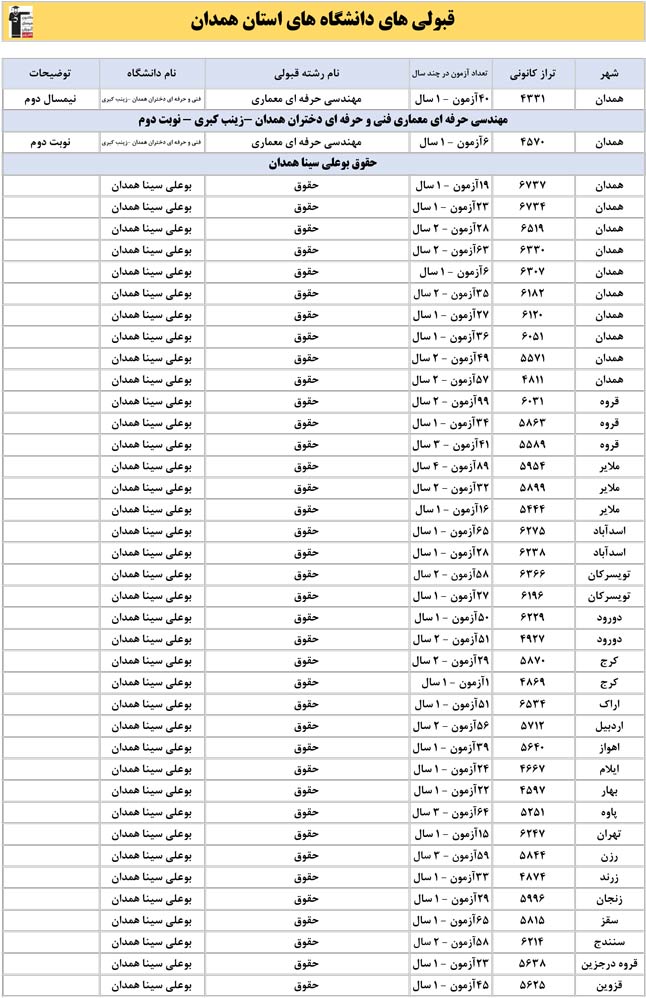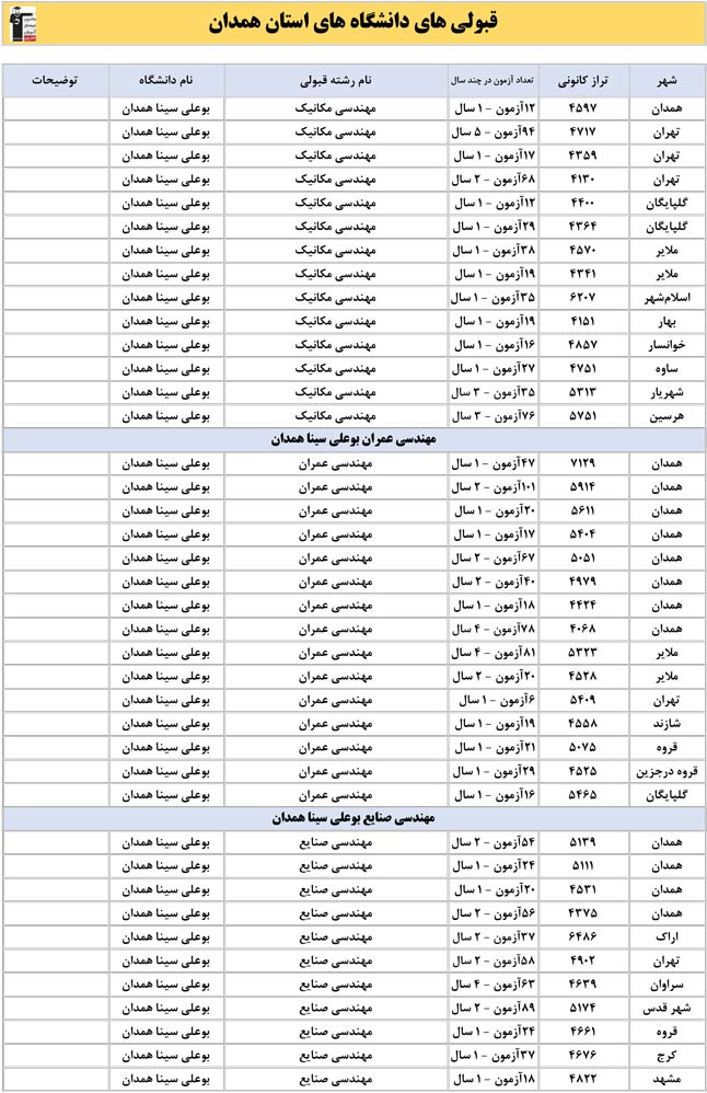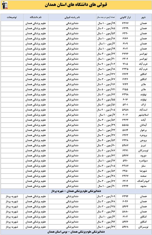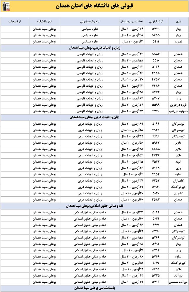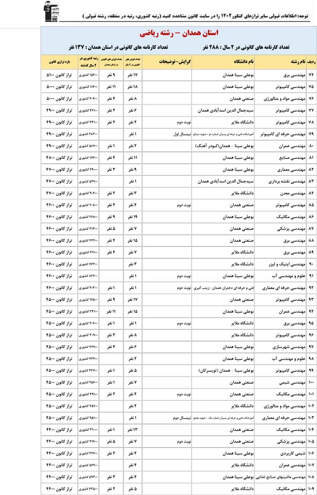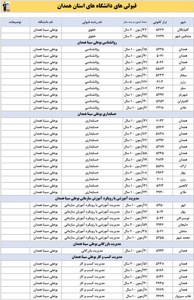 این آمار و اطلاعات مربوط به رشته های دانشگاه های استان همدان و دانش آموزان دو سال قبل کانون(کنکور1401 و 1402) می باشد .شما می توانید نمره ی تراز خود را پیدا کنید و متوجه شوید ، آن ها که پارسال ترازشان مثل شما بوده چه رشته هایی قبول شدند.