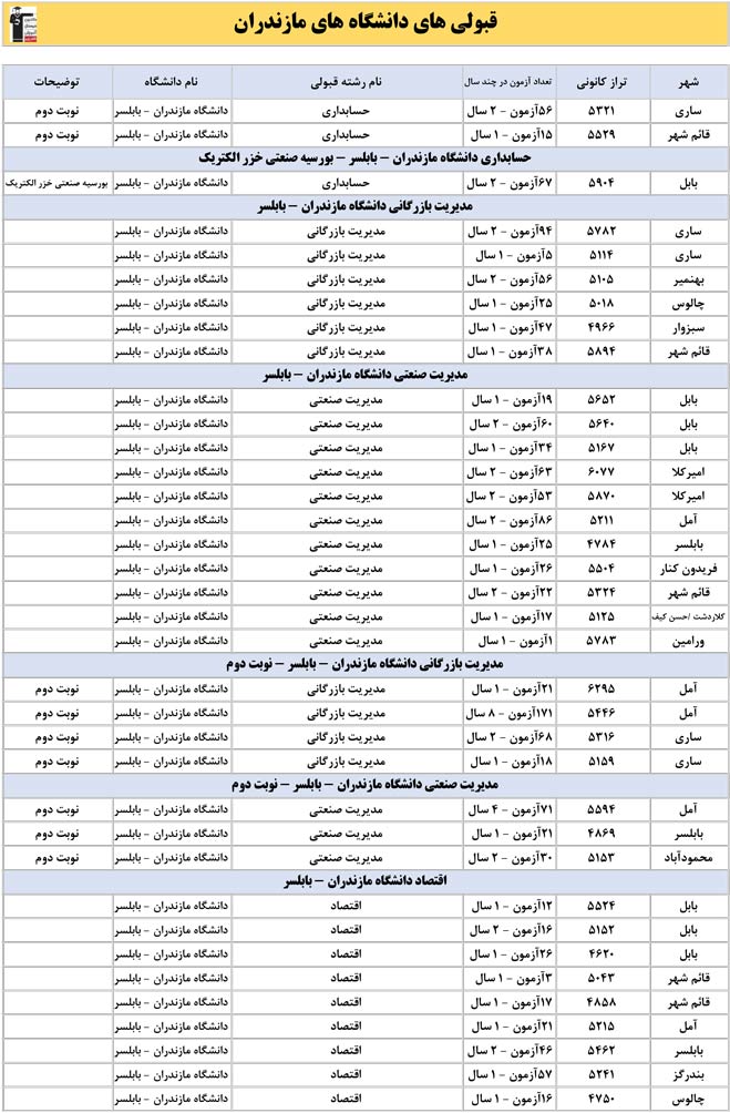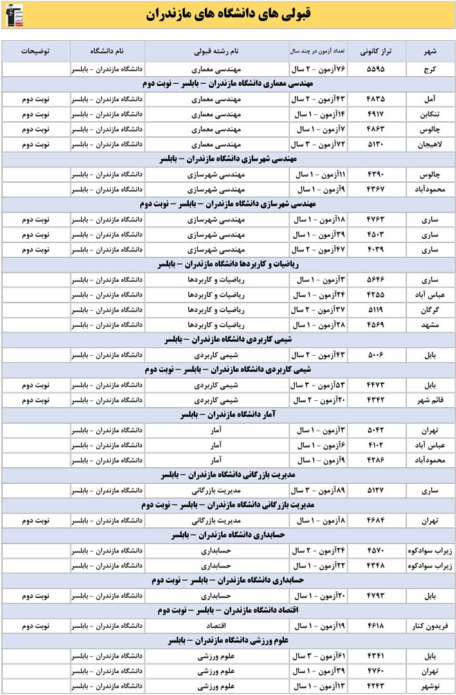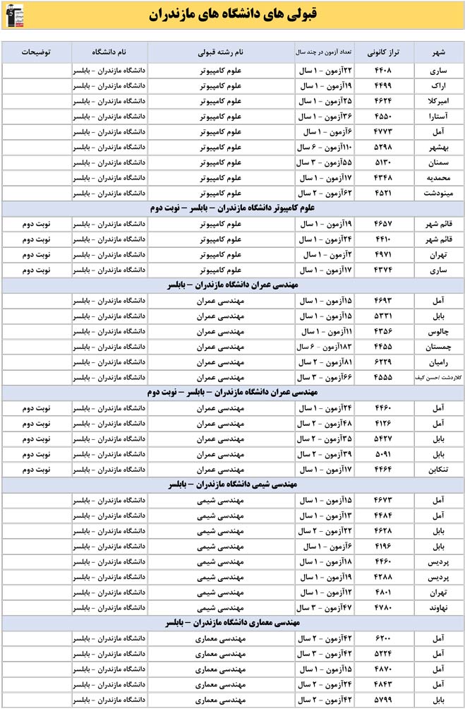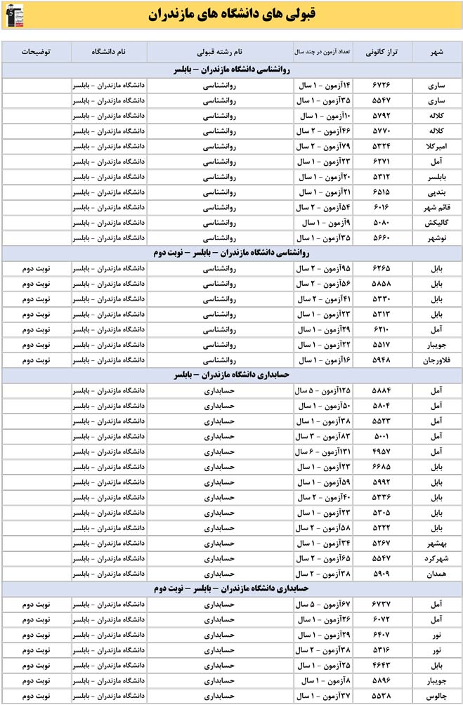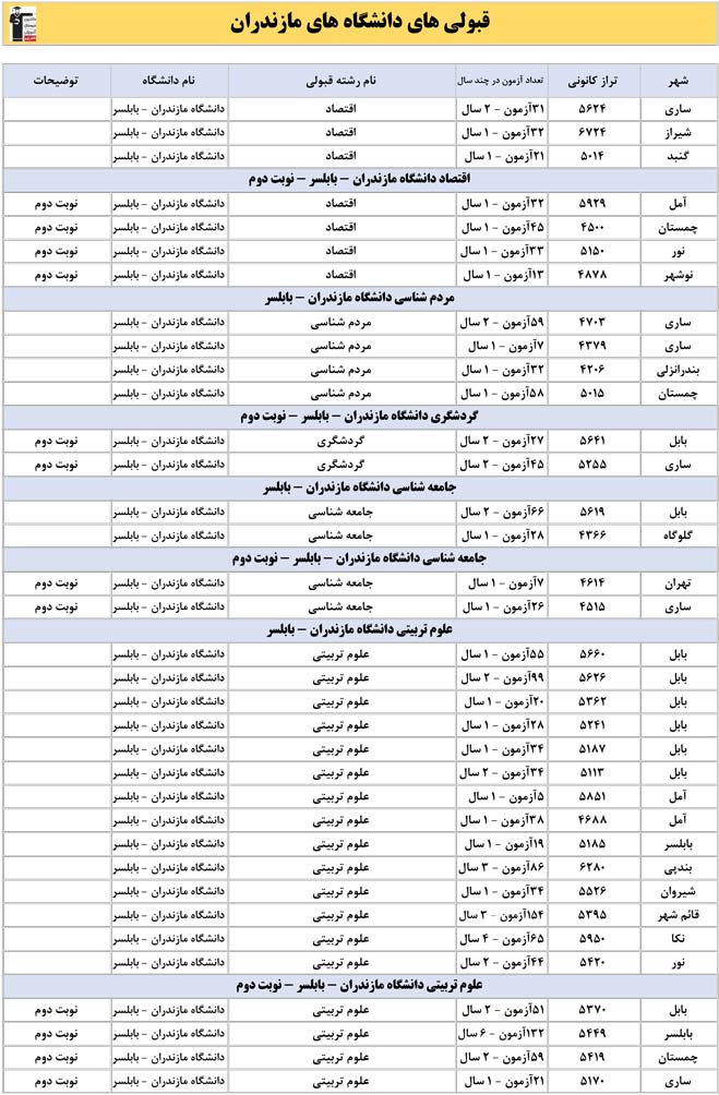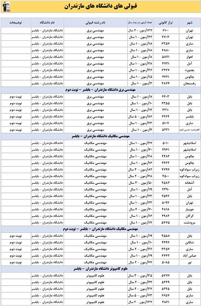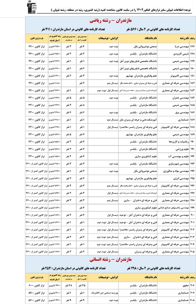 این آمار و اطلاعات مربوط به رشته های دانشگاه های استان مازندران و دانش آموزان دو سال قبل کانون(کنکور1401 و 1402) می باشد .شما می توانید نمره ی تراز خود را پیدا کنید و متوجه شوید ، آن ها که پارسال ترازشان مثل شما بوده چه رشته هایی قبول شدند.
