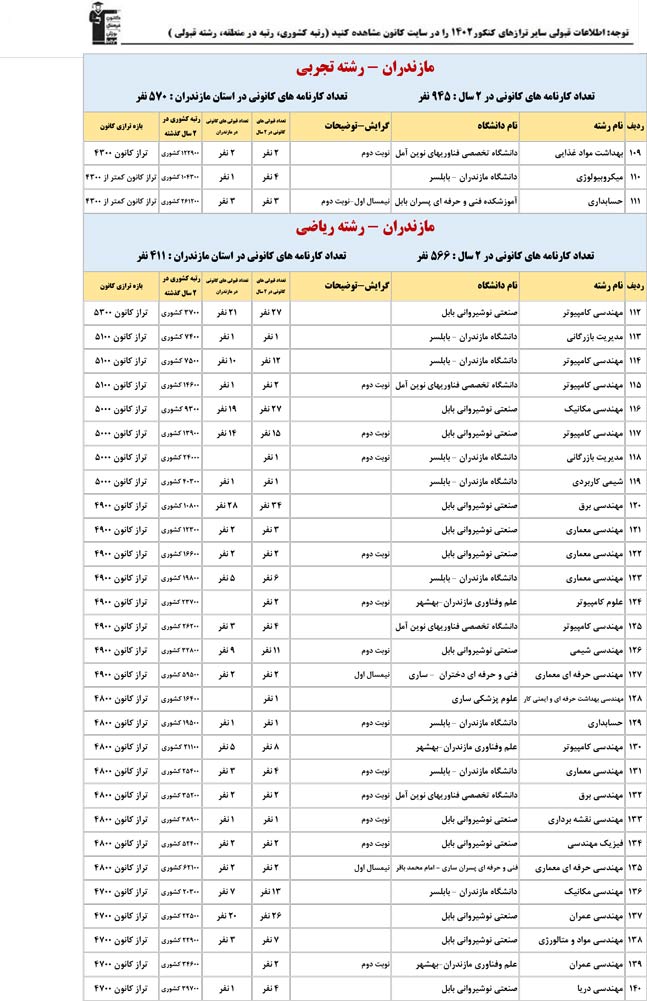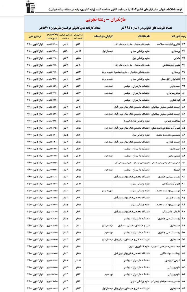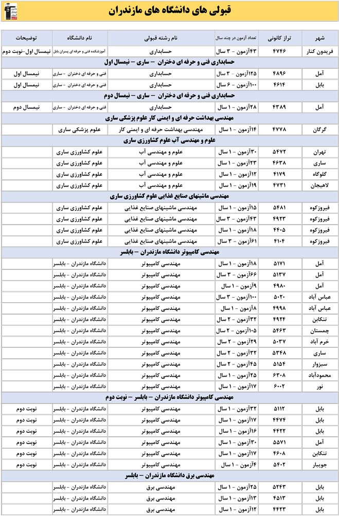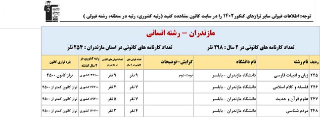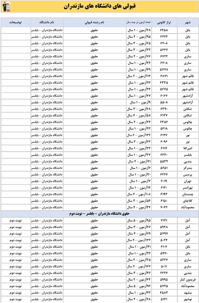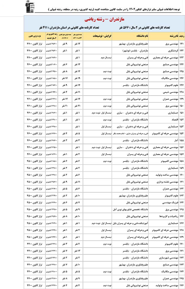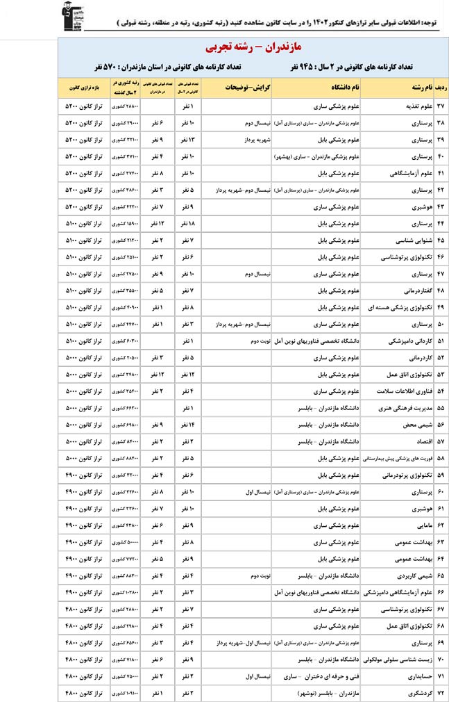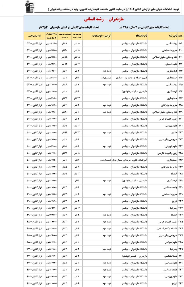 این آمار و اطلاعات مربوط به رشته های دانشگاه های استان مازندران و دانش آموزان دو سال قبل کانون(کنکور1401 و 1402) می باشد .شما می توانید نمره ی تراز خود را پیدا کنید و متوجه شوید ، آن ها که پارسال ترازشان مثل شما بوده چه رشته هایی قبول شدند.