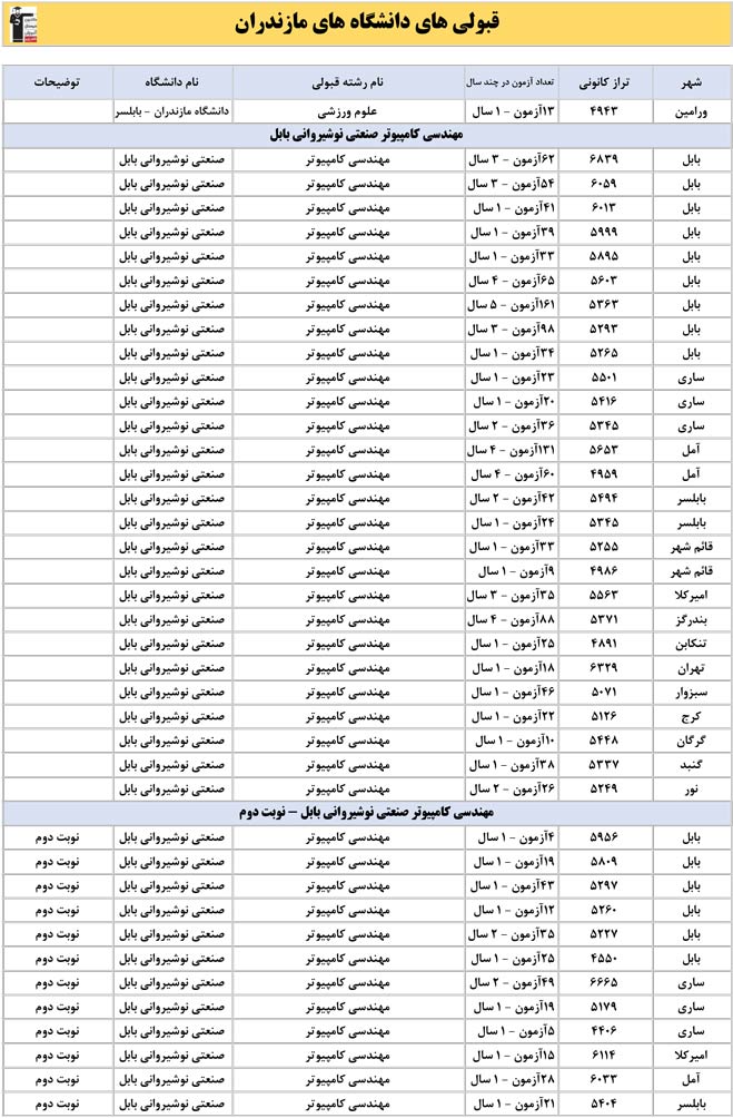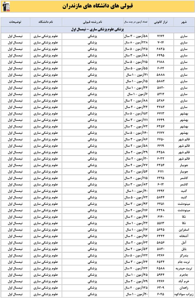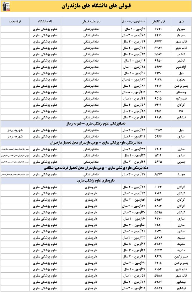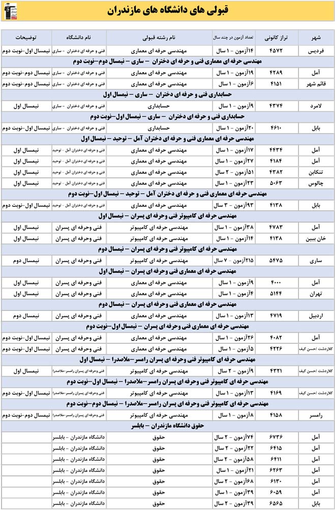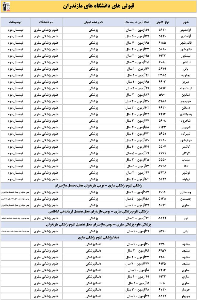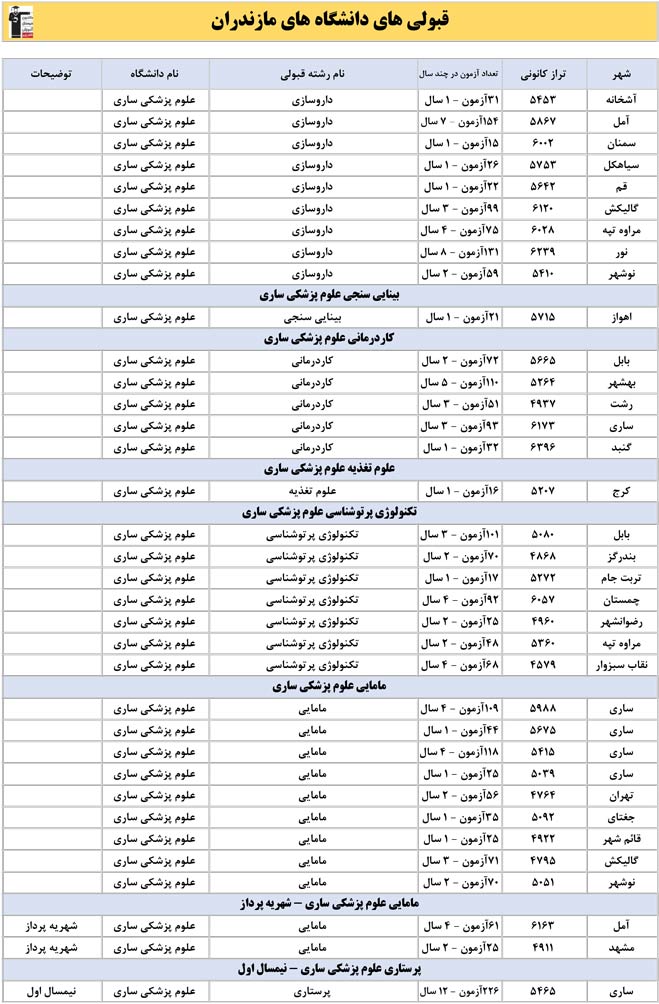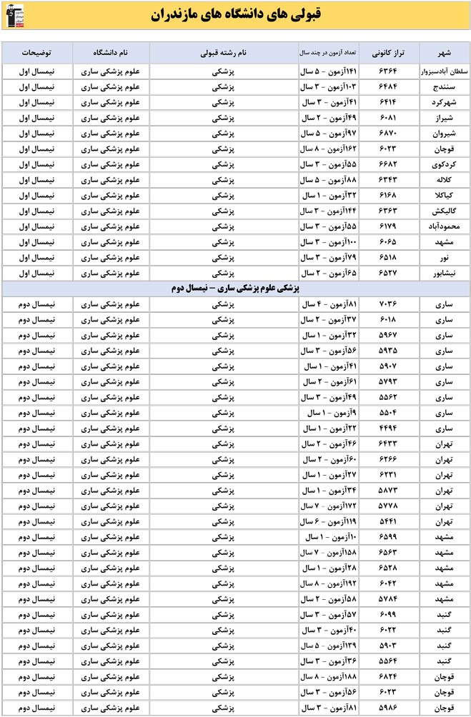 این آمار و اطلاعات مربوط به رشته های دانشگاه های استان مازندران و دانش آموزان دو سال قبل کانون(کنکور1401 و 1402) می باشد .شما می توانید نمره ی تراز خود را پیدا کنید و متوجه شوید ، آن ها که پارسال ترازشان مثل شما بوده چه رشته هایی قبول شدند.
