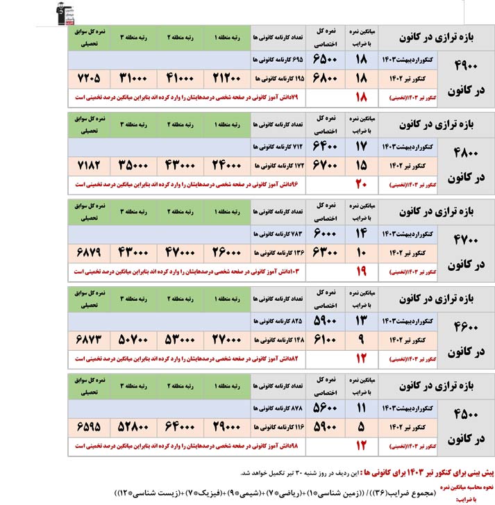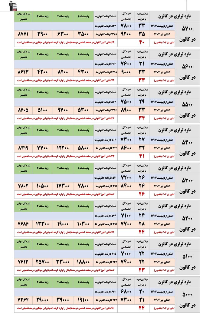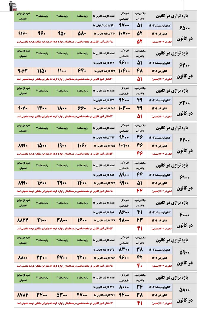 جدول زیر بر اساس نتایج کانونی ها در کنکور اردی بهشت 403 و کنکور تیر 402 تنظیم شده است