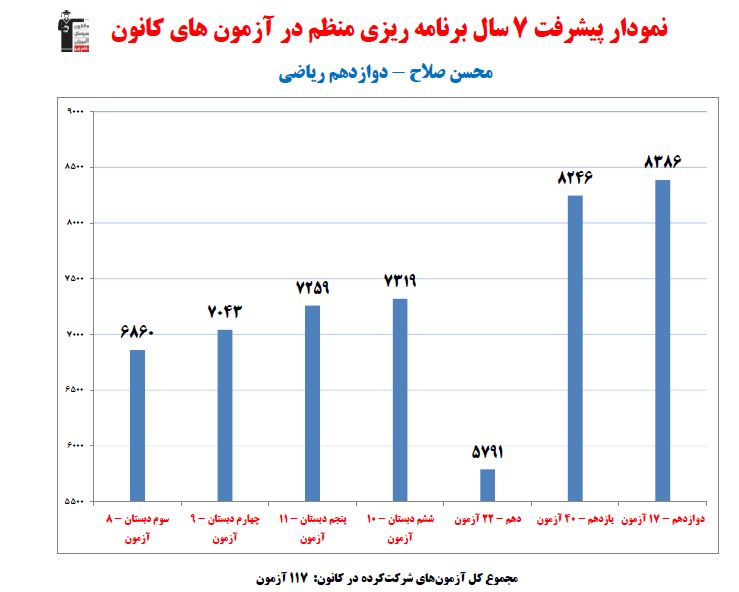 دانش آموز 7 سال درکانون بوده است ، از سوم تا ششم و دهم تا دوازدهم منظم و پوسته شرکت کرده استو 1439 پاسخ صحیح داشته است.