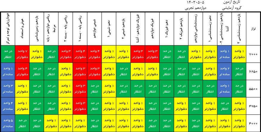 در این جدول برای هر درس رنگ های متفاوتی را می بینید .ممکن است یک درس برای یک بازه ی تراز دشوار و برای بازه ی تراز دیگر متعادل یا ساده باشد . ابتدا نمره ی تراز خود را در نظر بگیرید و سپس رنگ های هر درس را در بازه ی تراز خود ببینید . متوجه می شوید که آیا آن درس برای شما ساده تر از حد انتظار یا دشوارتر بوده یا این که متعادل بوده است .