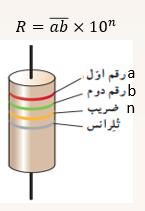 2-ترکیبی: معمولا از کربن و نیمرساناها ساخته میشوند که داخل پوشش پلاستیکی قرار میگیرد. با توجه به رنگ حلقههای روی آن مقاومتش از فرمول زیر بدست میآید.
