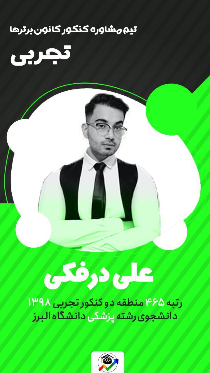 ![]() | علی درفکی رتبه 465 کنکور تجربی دانشجوی رشتهی پزشکی دانشگاه البرز |