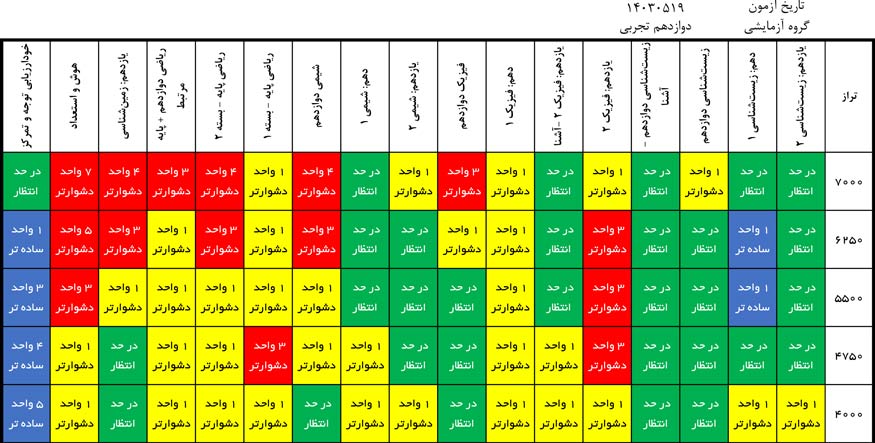 در این جدول برای هر درس رنگ های متفاوتی را می بینید .ممکن است یک درس برای یک بازه ی تراز دشوار و برای بازه ی تراز دیگر متعادل یا ساده باشد . ابتدا نمره ی تراز خود را در نظر بگیرید و سپس رنگ های هر درس را در بازه ی تراز خود ببینید . متوجه می شوید که آیا آن درس برای شما ساده تر از حد انتظار یا دشوارتر بوده یا این که متعادل بوده است .