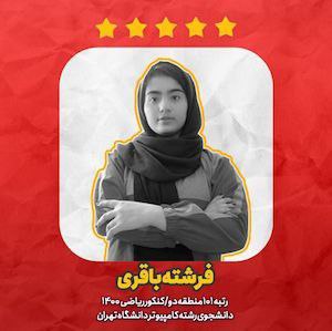 ![]() | فرشته باقری رتبه 101 کنکور ریاضی 1400 دانشجوی رشتهی کامپیوتر دانشگاه تهران |