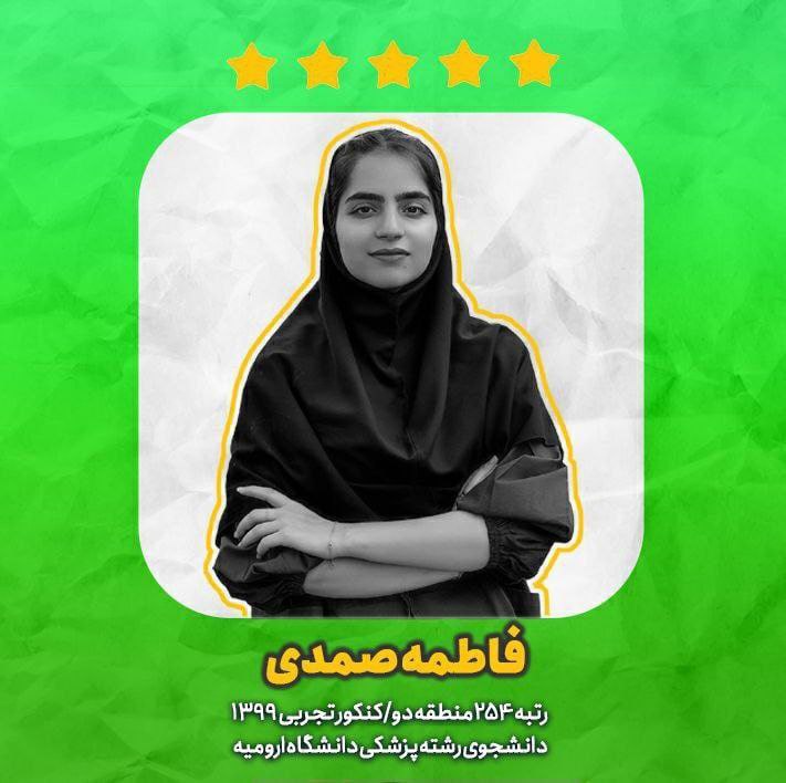 ![]() | فاطمه صمدی رتبه 254 کنکور تجربی 99 دانشجوی رشتهی پزشکی دانشگاه ارومیه | |