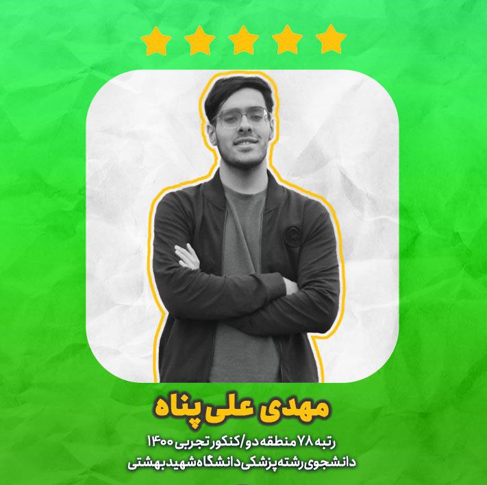 ![]() | مهدی علیپناه رتبهی 78 کنکور تجربی دانشجوی رشتهی پزشکی دانشگاه شهیدبهشتی |