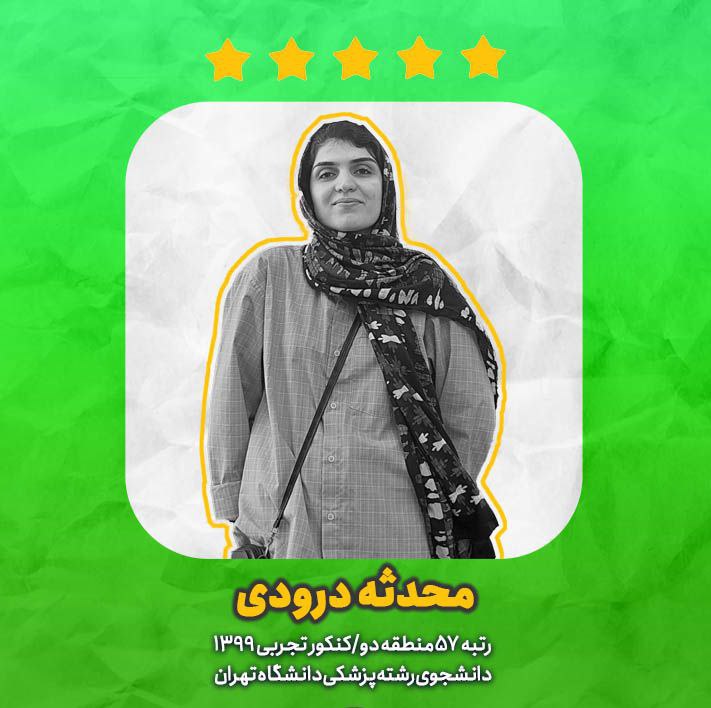 ![]() | محدثه درودی رتبه 57 کنکور تجربی دانشجوی رشتهی پزشکی دانشگاه تهران |