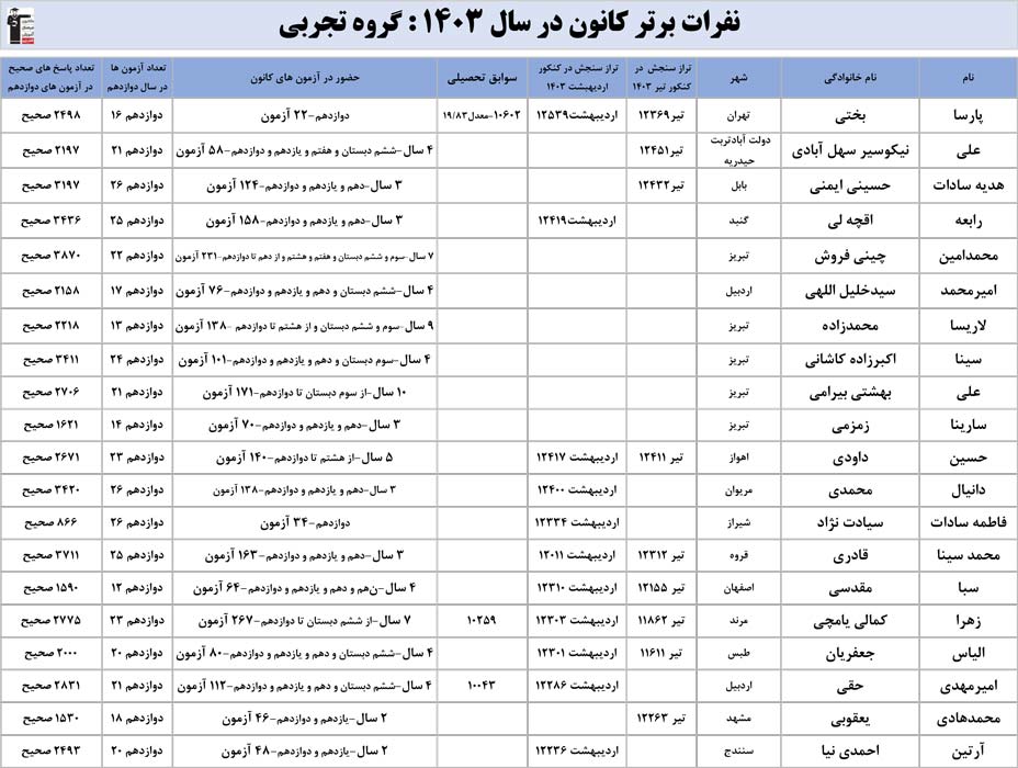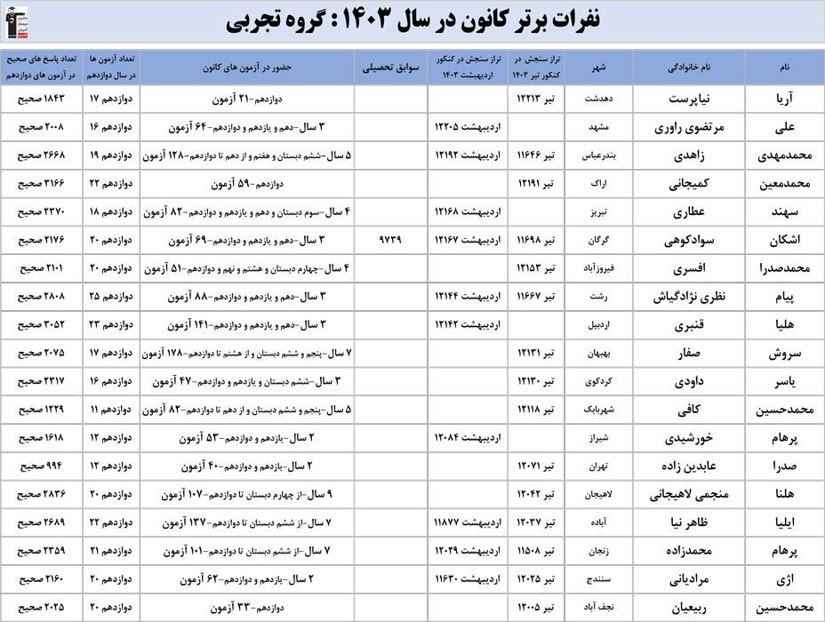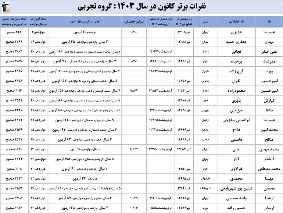 در لیست زیر با برخی از نفرات برتر کانون در گروه تجربی در سال 1403 _ شرکت کنندگان در کنکور 1403 آشنا شوید.