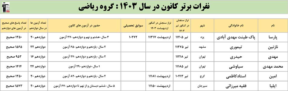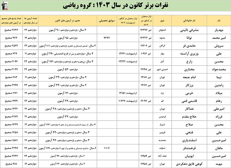 در لیست زیر با برخی از نفرات برتر کانون در گروه ریاضی در سال 1403 _ شرکت کنندگان در کنکور 1403 آشنا شوید.