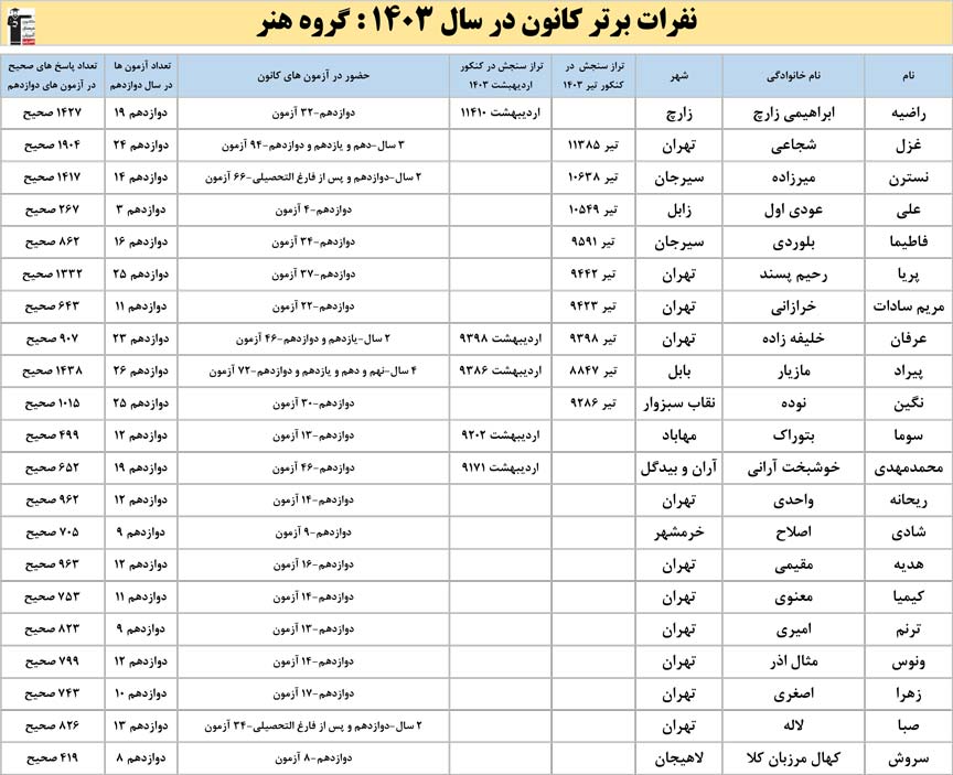 در لیست زیر با برخی از نفرات برتر کانون در گروه هنر و منحصرا زبان در سال 1403 _ شرکت کنندگان در کنکور 1403 آشنا شوید.