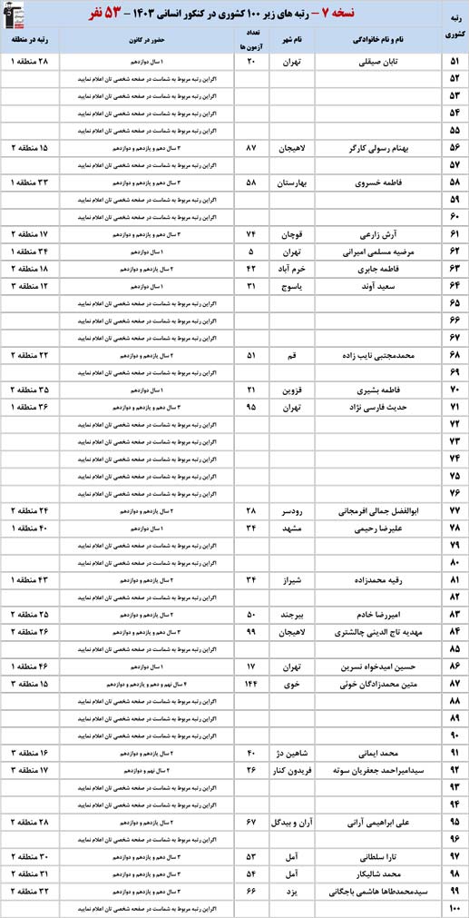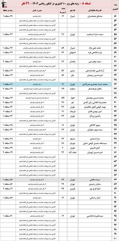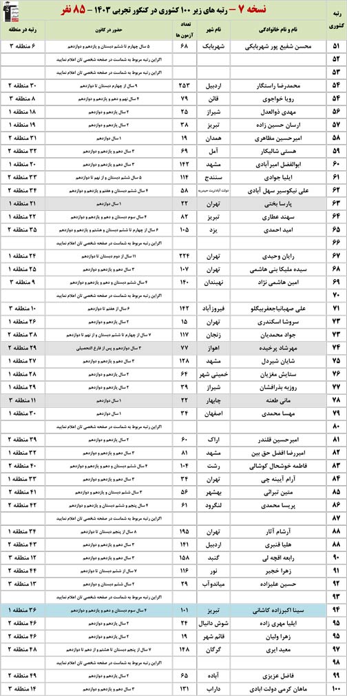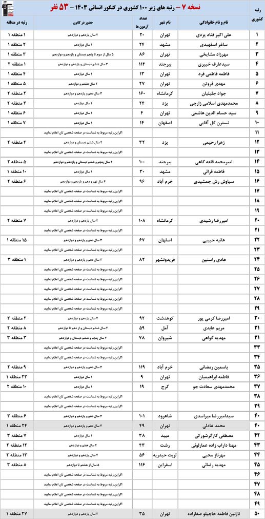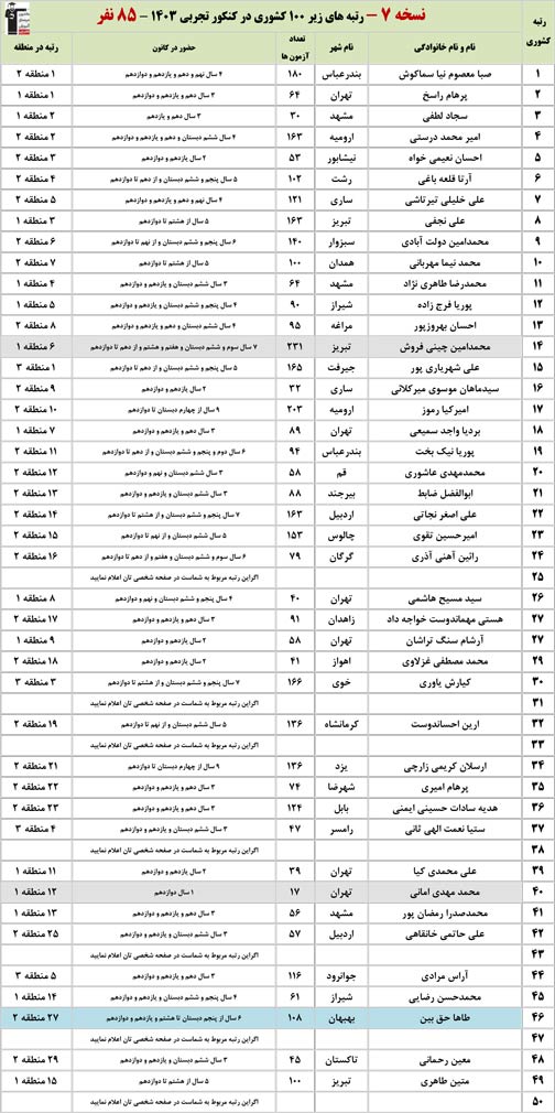 با رتبه های زیر 100 کشور آشنا شوید؟(کنکور1403)اگر رتبه زیر 100 دارید کارنامه را در صفحه شخصی بفرستید تا جدول تکمیل شود.نسخه جدید - نسخه هفتم