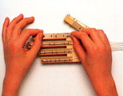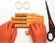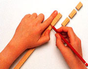 2- انگشتان خود را به ترتيب کنار نوار چوبي قرار دهيد و طول هر انگشت و قسمتهاي آن را روي نوار علامتگذاري نماييد. از يک بزرگتر بخواهيد که 14 قطعهاي را که علامتگذاري کردهايد ببرد (دو تا قطعه براي شست و سه تا براي هر يک از انگشتان ديگر)