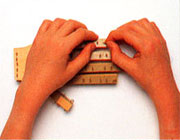 1- شکل کف دست را روي بلوک چوبي رسم نماييد. قسمت بالايي کف دست بايد داراي عرض تقريبي 6/5 سانتيمتر باشد. چوب را نگه داشته و از يک بزرگتر بخواهيد که شکل را براي شما ببرد. اکنون به انگشتان خود دقت کنيد. آيا هر کدام از قسمتها داراي طول يکسان هستند؟
