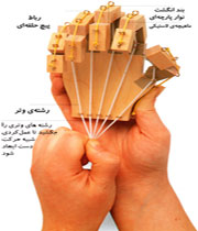 6- حال "دست" شما آماده است. بلوک چوبي را با يک دست و تمام ريسمانها را با دست ديگر بگيريد. وقتي شما ريسمانها را ميکشيد، در واقع عمل زردپيها متصل به ماهيچههاي انتهاي دستتان را تقليد ميکنيد. نخهاي عبوري از قلابها، در واقع نشانگر حلقههاي رباط و مواد فيبري در مچ و بند انگشت است. نوارهاي کشي، کشش "دست" را تامين ميکنند شبيه ماهيچههاي پشت دست. در اين "دست"، انگشتان به سمت داخل خم شده و شبيه گرفتن شي عمل ميکنند. آيا ميتوانيد مدل دست را طوري حرکت دهيد تا روي ميز طبل بزن؟