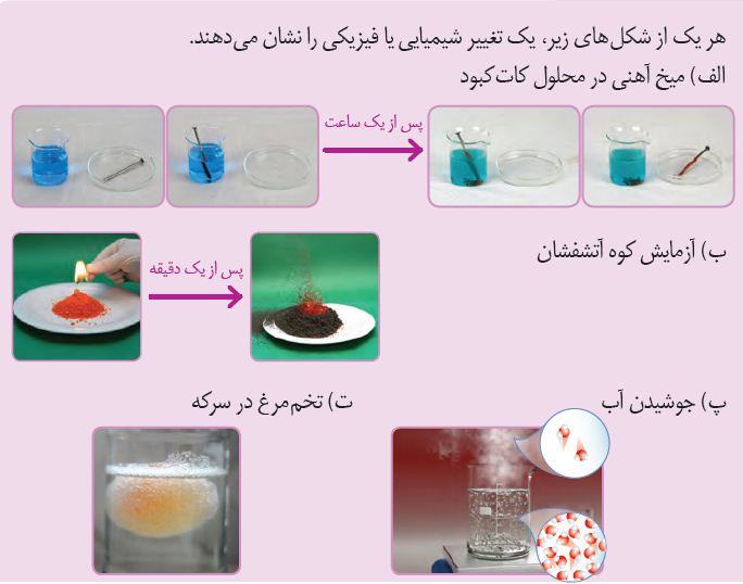 نکته: اگر یک تغییر شیمیایی در شرایط مناسبی انجام شود می تواند کار انجام دهد و جسمی را جابه جا کند. در آزمایش قرص جوشان در اثر تغییر شیمیایی قوطی فیلم چند متر به سمت بالا پرتاب می شود. تغییر شیمیایی انجام شده این آزمایش را می توان به صورت زیر نشان داد. گاز کربن دی اکسید + نمک <= ویتامین(C) + جوش شیرین |