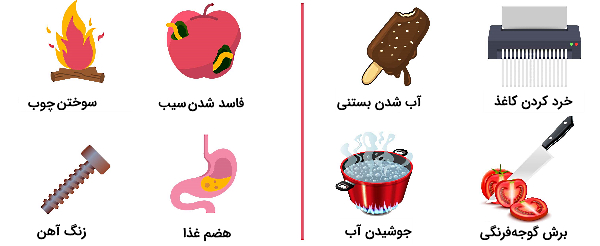تغییر فیزیکی چیست؟ به تغییری گفته می شود که در آن اندازه و حالت و.... ماده تغییر می کند ولی نوع مولکول های ماده عوض نمی شود و ماده جدیدی بوجود نمی آید. مثل: پاره کردن کاغذ شکستن چوب اره کردن چوب | ![]() |