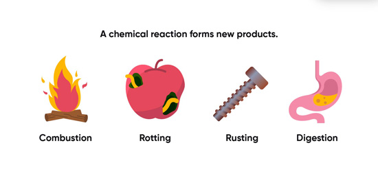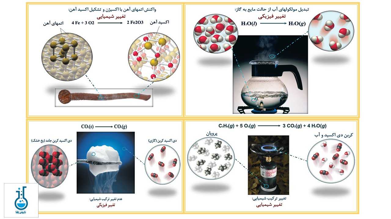 تغییر شیمیایی چیست؟ به تغییری گفته می شود که در آن علاوه بر تغییرات فیزیکی، نوع مولکولهای ماده عوض می شود و ماده ی جدیدی حاصل می شود و مواد جدید خواص ماده ی اولیه را ندارند. مثل فاسد شدن گوشت - تغییر رنگ برگ درختان - انواع سوختن - پختن نان | ![]() |