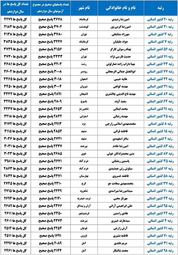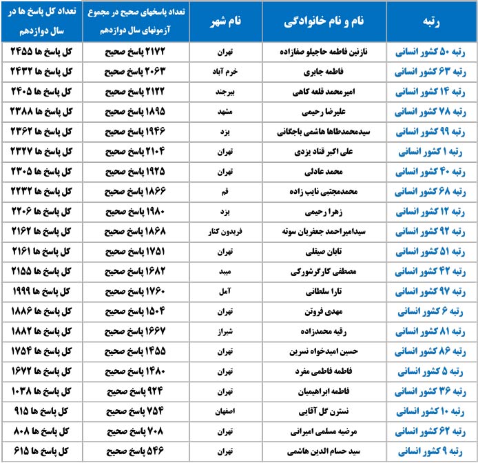 در جدول زیر تعداد پاسخ های صحیح رتبه های زیر ۱۰۰ کنکور را در آزمون های کانون مشاهده می کنید ...