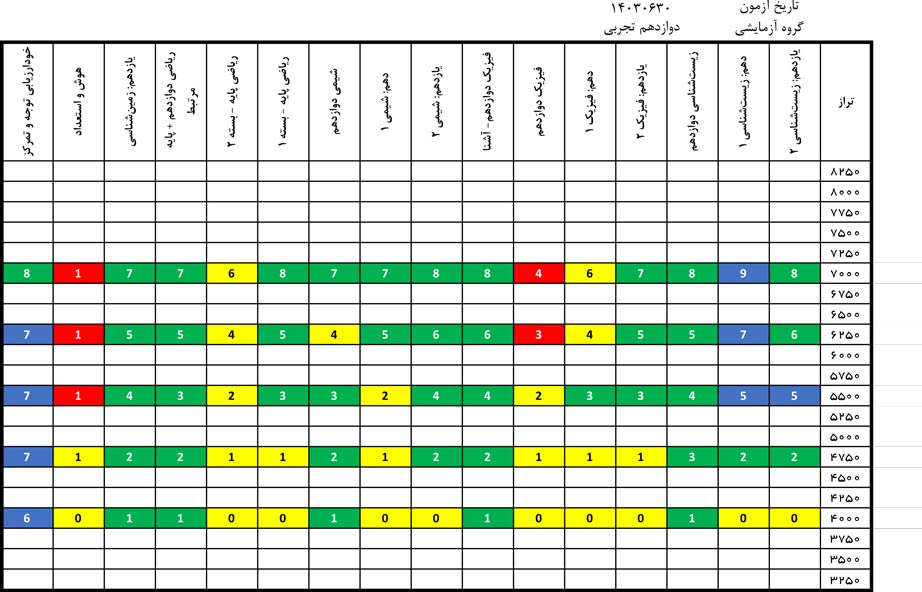 در این جدول برای هر درس رنگ های متفاوتی را می بینید .ممکن است یک درس برای یک بازه ی تراز دشوار و برای بازه ی تراز دیگر متعادل یا ساده باشد . ابتدا نمره ی تراز خود را در نظر بگیرید و سپس رنگ های هر درس را در بازه ی تراز خود ببینید . متوجه می شوید که آیا آن درس برای شما ساده تر از حد انتظار یا دشوارتر بوده یا این که متعادل بوده است .