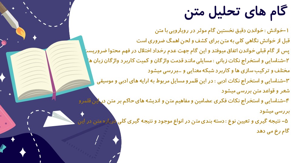 قلمرو های بررسی متن شامل قلمرو ادبی، زبانی و فکری میباشد.