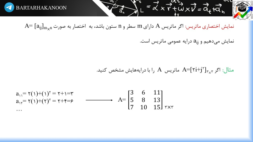 هر آرایش مستطیلی از اعداد حقیقی را ماتریس مینامیم. مارتیسها را با حروف بزرگ انگلیسی نشان میدهیم. هر ماتریسی m سطر و n ستون دارد و میخوانیم ماتریس A از مرتبه m در n است.