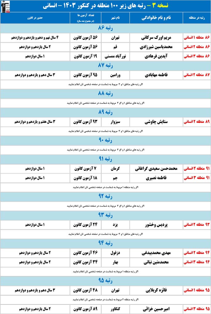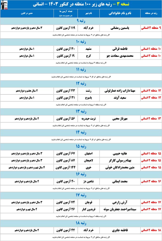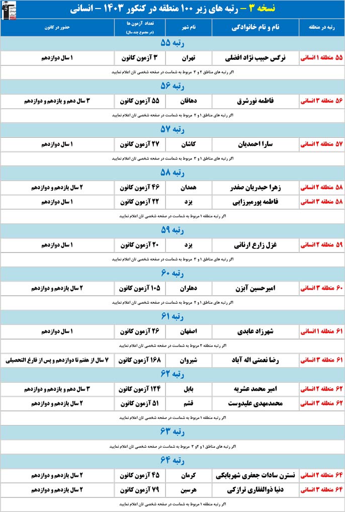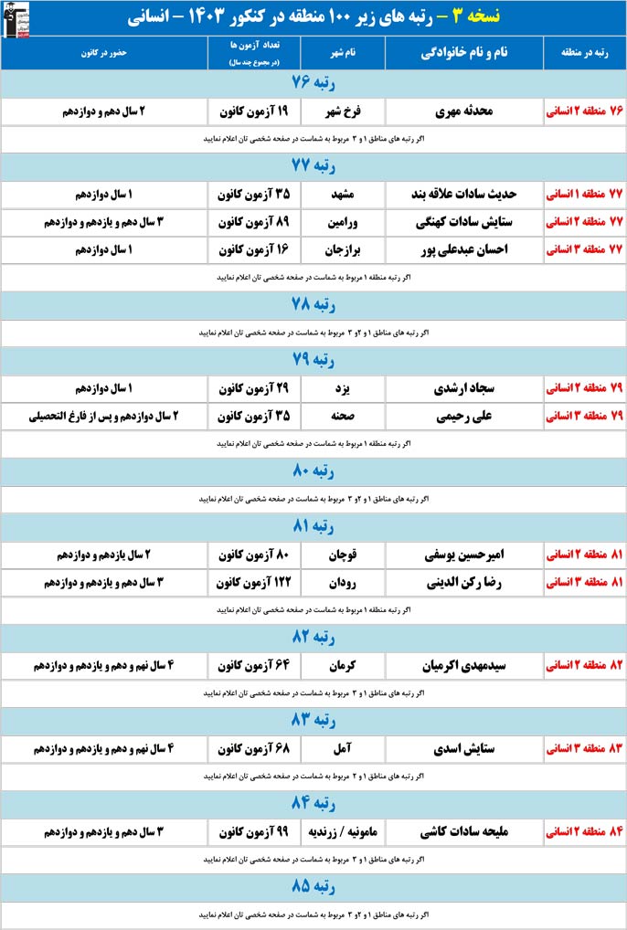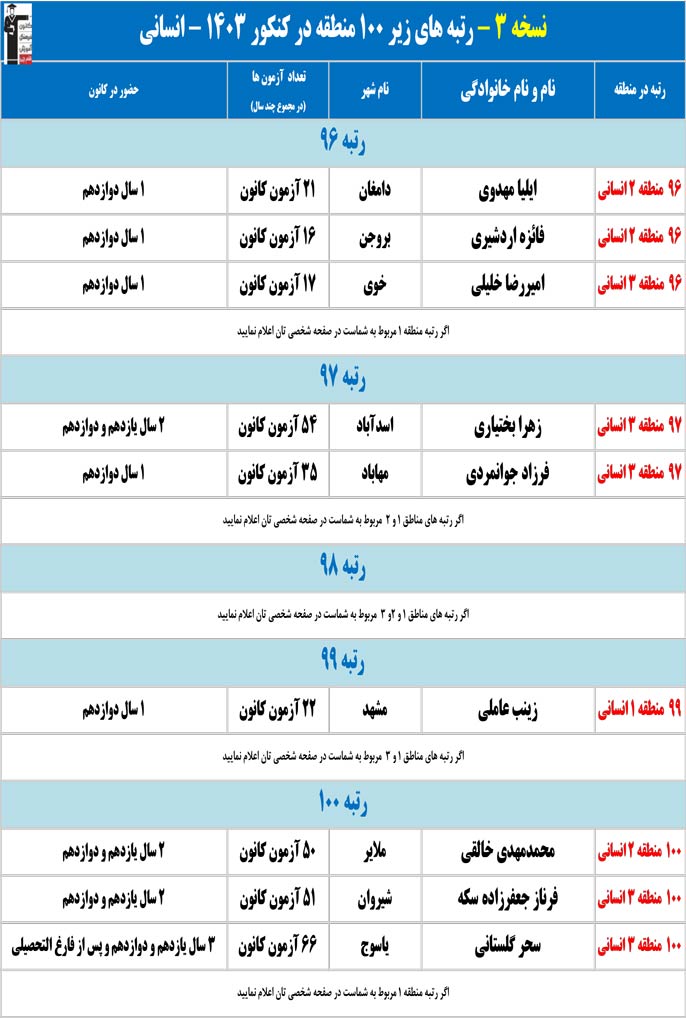 رتبههای زیر 100 سه منطقه در کنکور 1403 (رشته انسانی) را در ادامه مشاهده کنید...تکمیل فرم ویژه جوایز کنکوری ها در صفحه شخصی