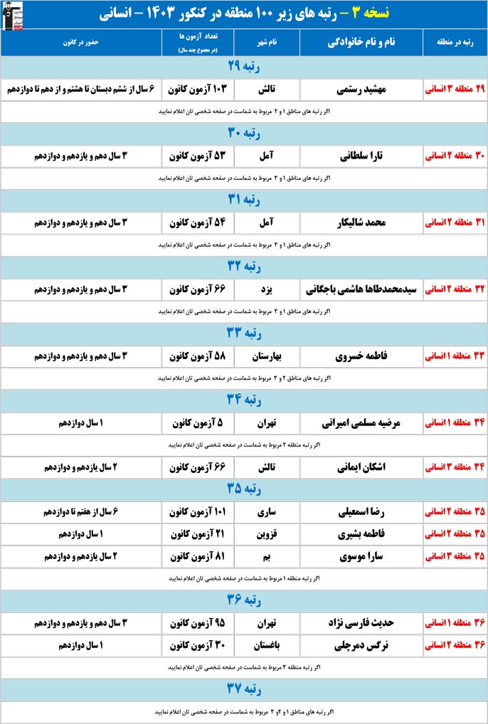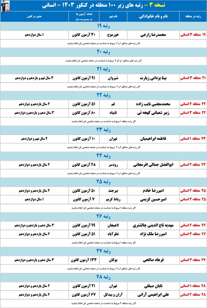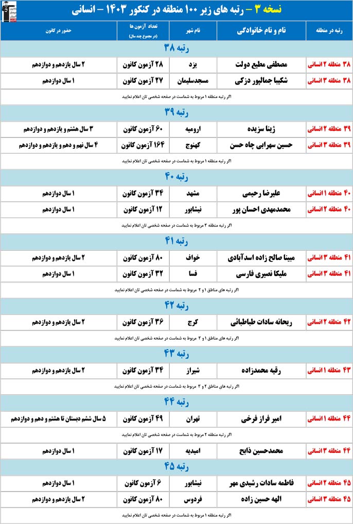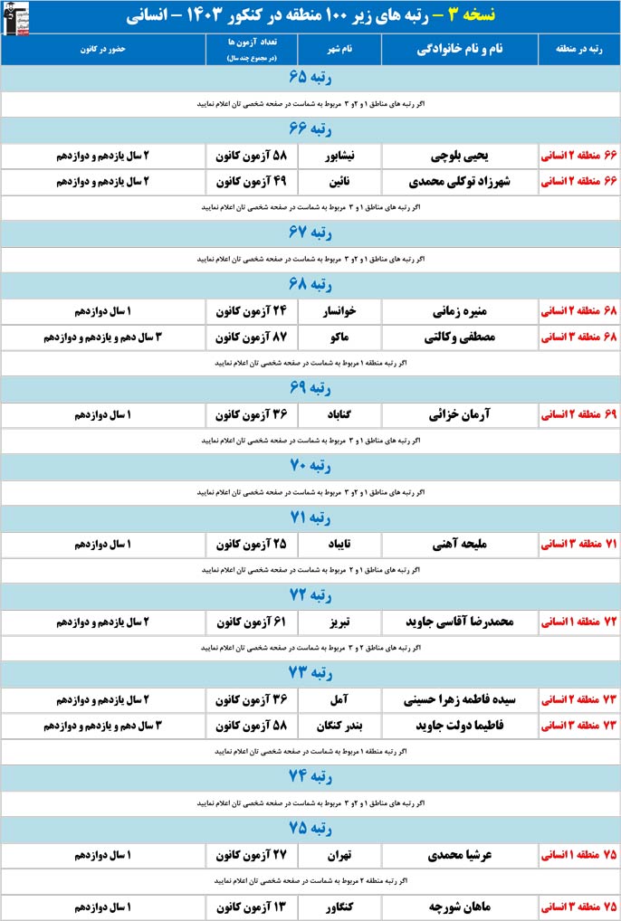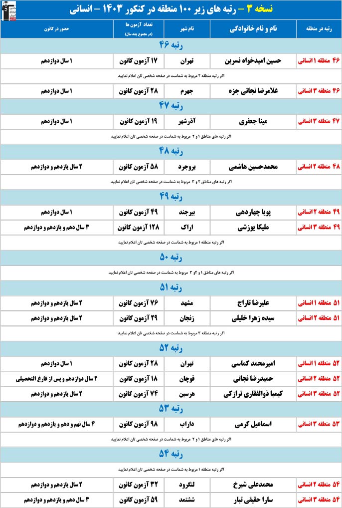 رتبههای زیر 100 سه منطقه در کنکور 1403 (رشته انسانی) را در ادامه مشاهده کنید...تکمیل فرم ویژه جوایز کنکوری ها در صفحه شخصی