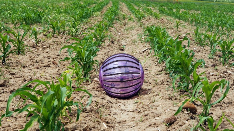 این ربات که کروی می تواند بر روی زمین ناهموار قل بخورد و بر روی محصولات نظارت کند.