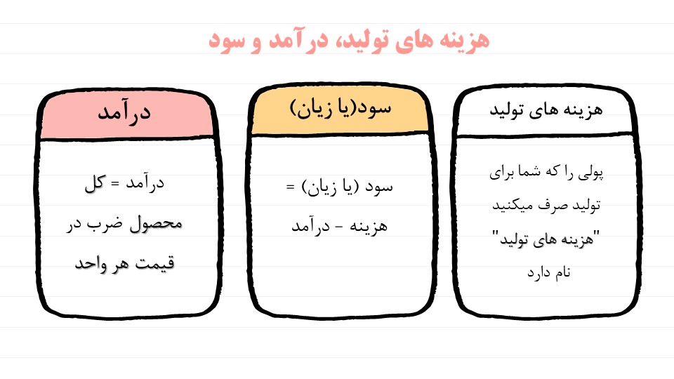 مهم: صاحب کسب و کار قبل از رسیدن به عایدی(درآمد)، هزینه ها را متحمل میشود و در پایان همه محصول و سود یا زیان هر چه باشد به صاحب یا صاحبان کسب و کار میرسد