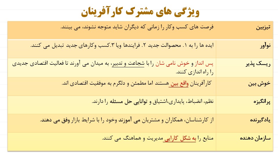 کار آفرینان اگرچه تفاوت هایی با یکدیگر دارند اما در این ویژگی ها با هم اشتراک دارند: