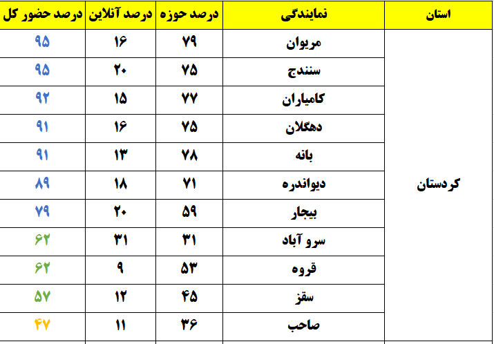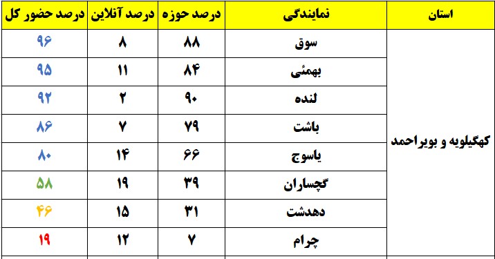 رنگ زرد : درصد حضور بین 26 تا 50 ، تعداد نمایندگی : 38 شهر